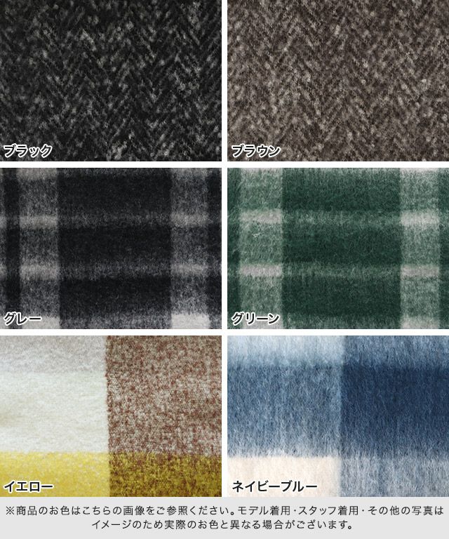 ブラック、ブラウンは大人シックに決まるヘリンボーン柄。グレー、グリーンは単色なので大きめチェックでも使いやすい柄。ネイビーブルー、イエローはコーデのアクセントになる華やかなカラーチェック。