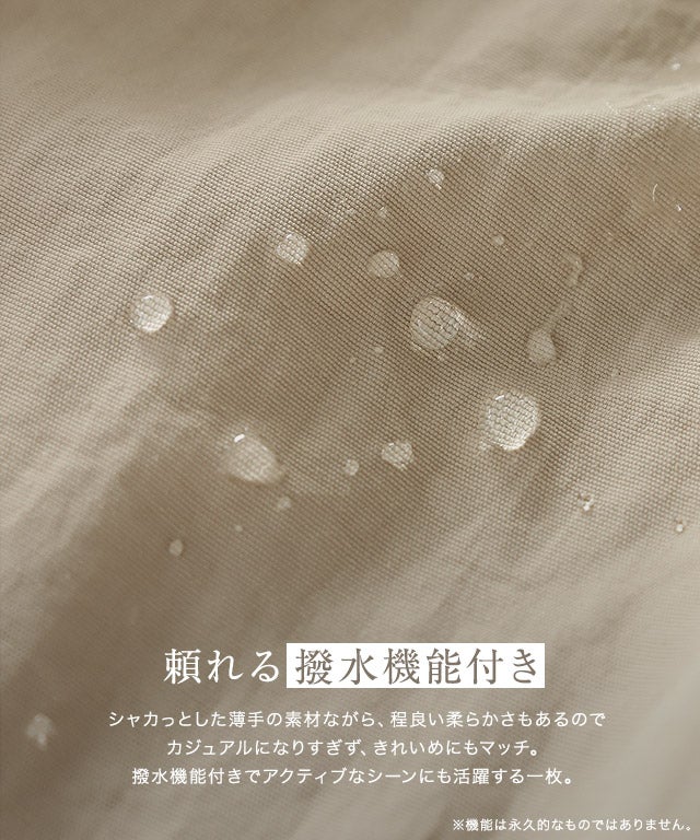 シャカっとした薄手の素材ながら、程良い柔らかさもあるのでカジュアルになりすぎず、UVカット機能付きなのでアクティブなシーンにも活躍する一枚。