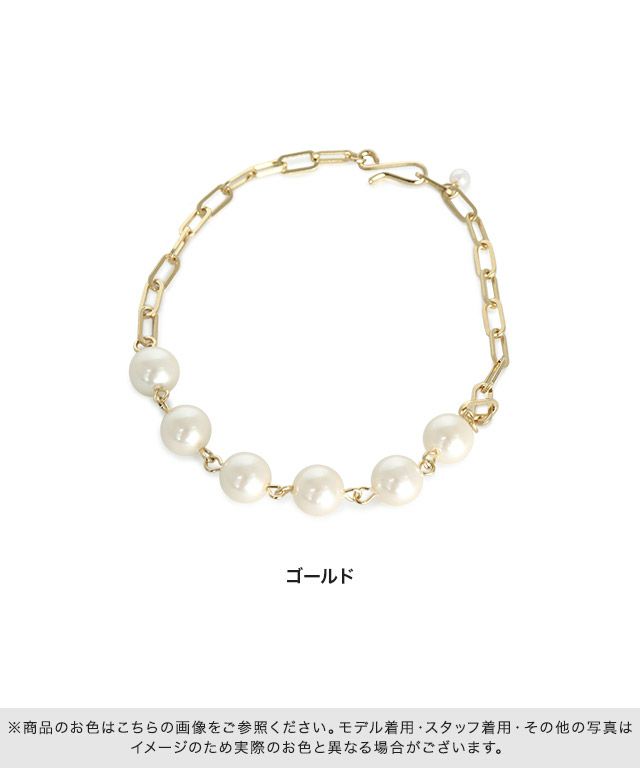 存在感のあるデザインチェーンがどんなスタイルにも合わせやすく、上品な印象をプラスするイミテーションパールをあしらい、プレーティングはゴールドで高見えを叶えます。