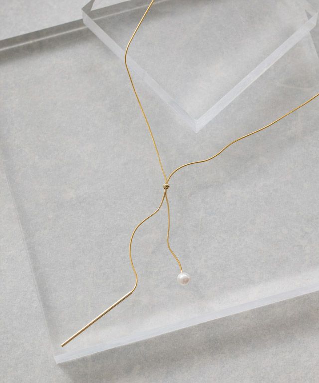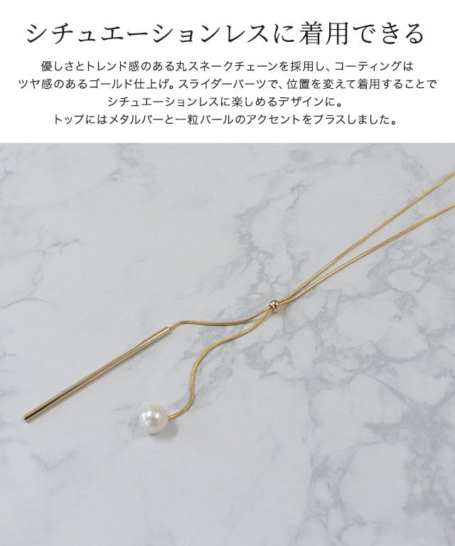 スライダーパーツで、位置を変えて着用することでシチュエーションレスに楽しめるデザインに。トップにはメタルバーと一粒パールのアクセントをプラスしました。