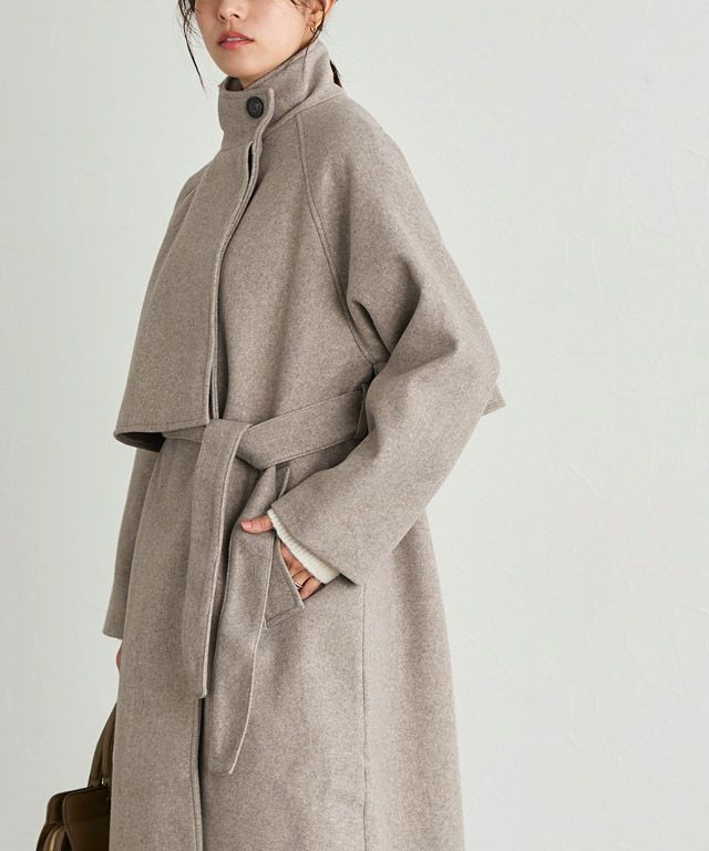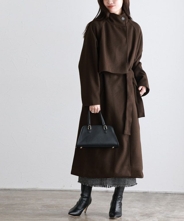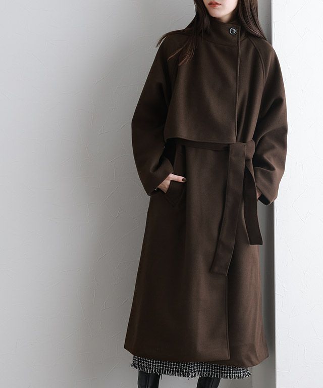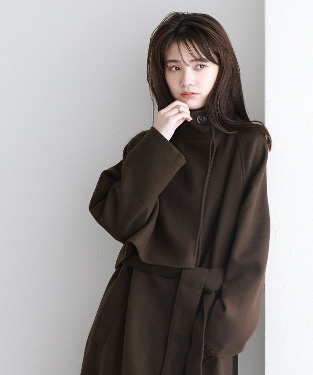 旬の装いを叶えるスタンドカラーとケープデザインで着映え感のあるコート。フロントの開閉で印象が変わり、着回しの幅が広がるところも魅力の一つです。