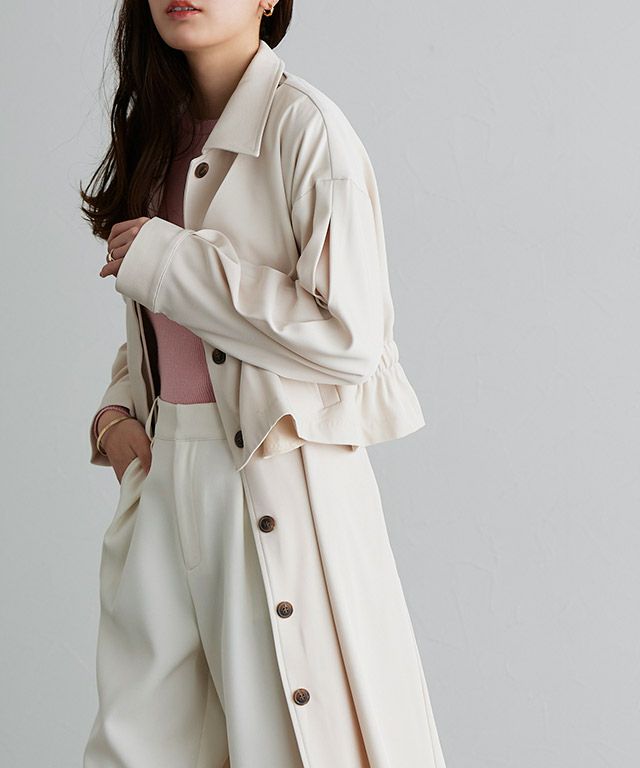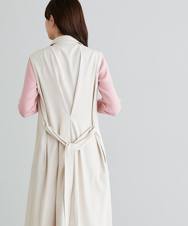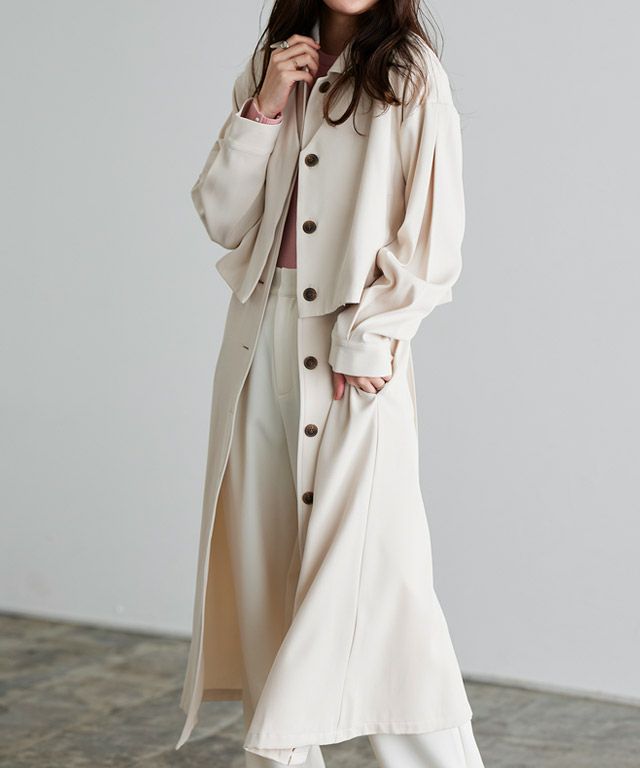 トレンチコート、ジレ、ブルゾン、ノースリーブワンピースとして着用できるマルチway仕様。足元まであるロング丈と、程よくボリュームを持たせた袖シルエットがこなれた印象に導きます。ボタンをマーブルにすることでアクセントとなり、さらっと羽織るだけでサマになる一枚です。付属のベルトでウエストマークができ、様々な着こなしができるところもポイントです。