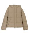 ほんのりとツヤを感じるパウダリータッチな表面感が肌触りの良いポリエステルタフタ素材。中綿には細かい繊維のファイバーダウンをたっぷりと使用しているので、リアルダウンのような柔らかさと、軽くて暖かい防寒性の高さが魅力です。
