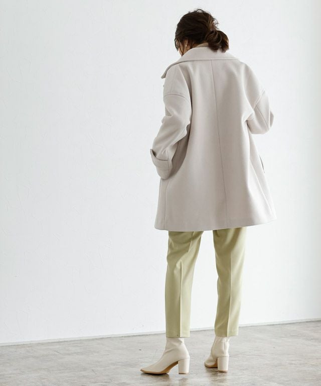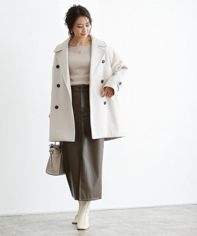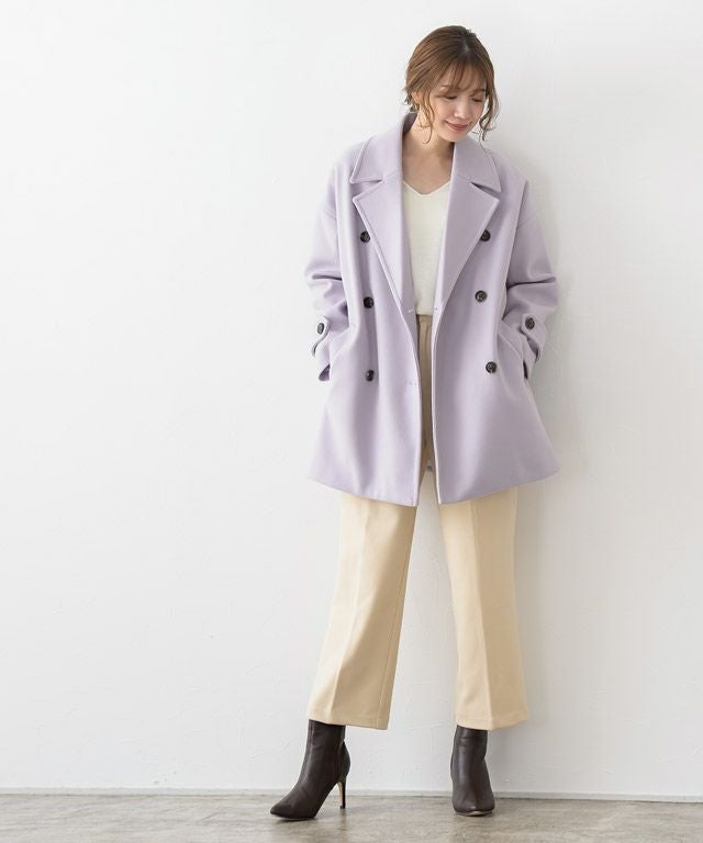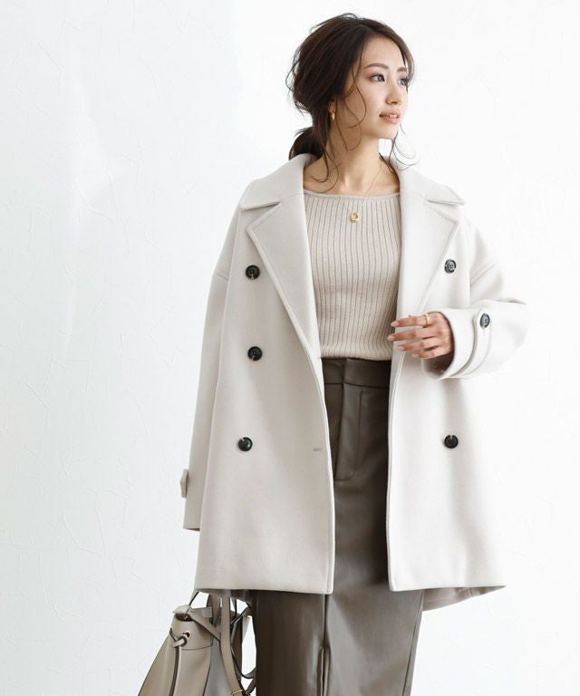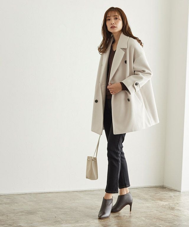 定番のPコートはかっちりしすぎないサイズに仕上ることで今っぽい雰囲気をプラス。合わせやすい着丈はボトムスを選ばず、飽きのこないシンプルなデザインなのでワードローブにしたい一着。