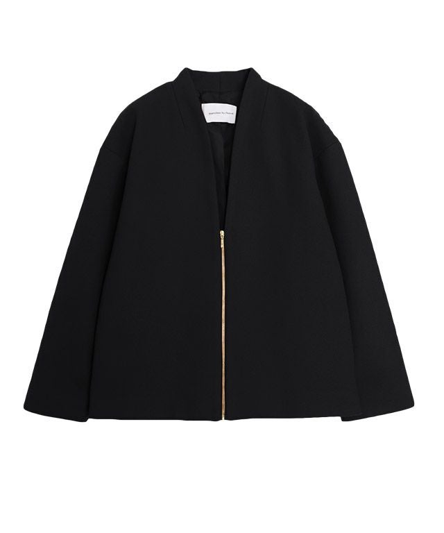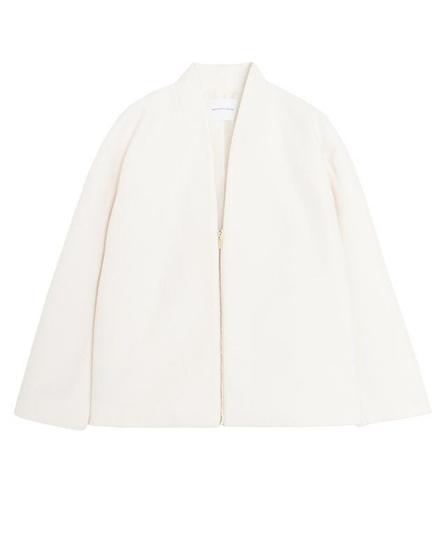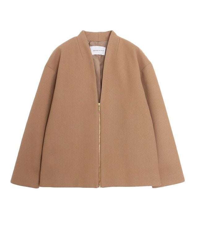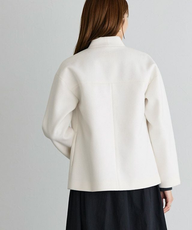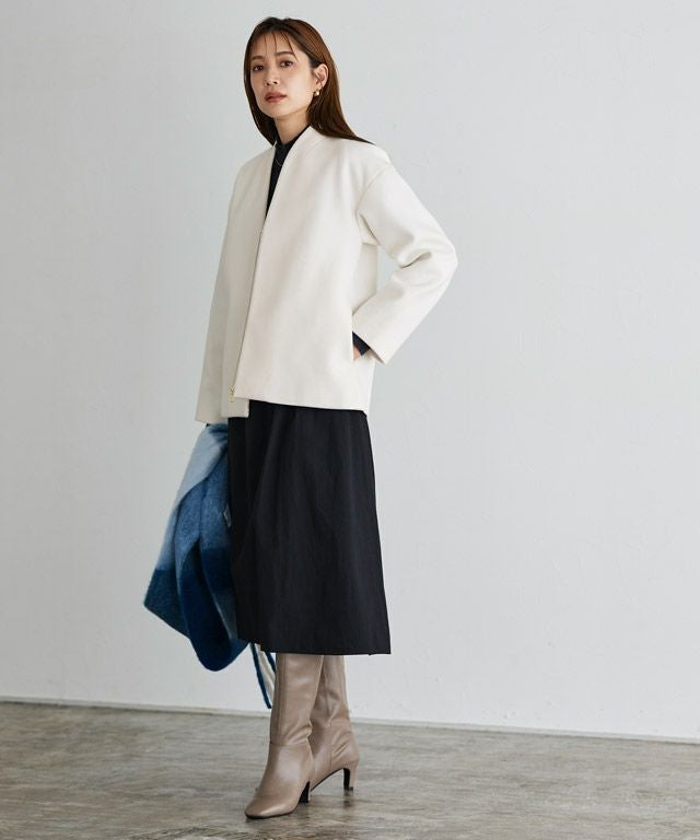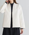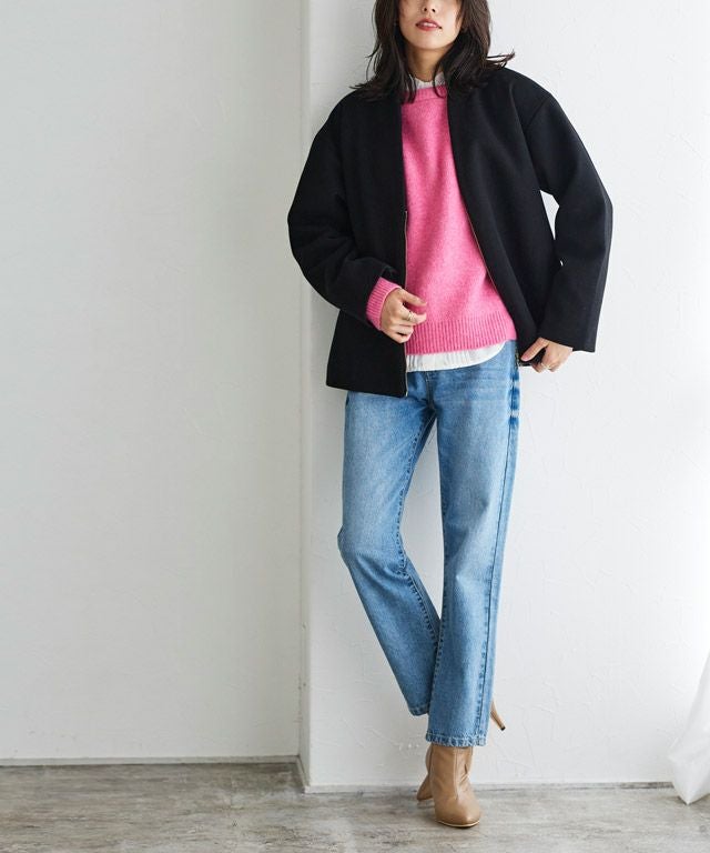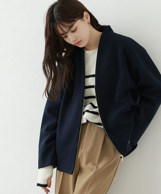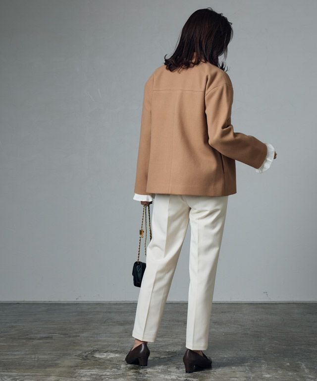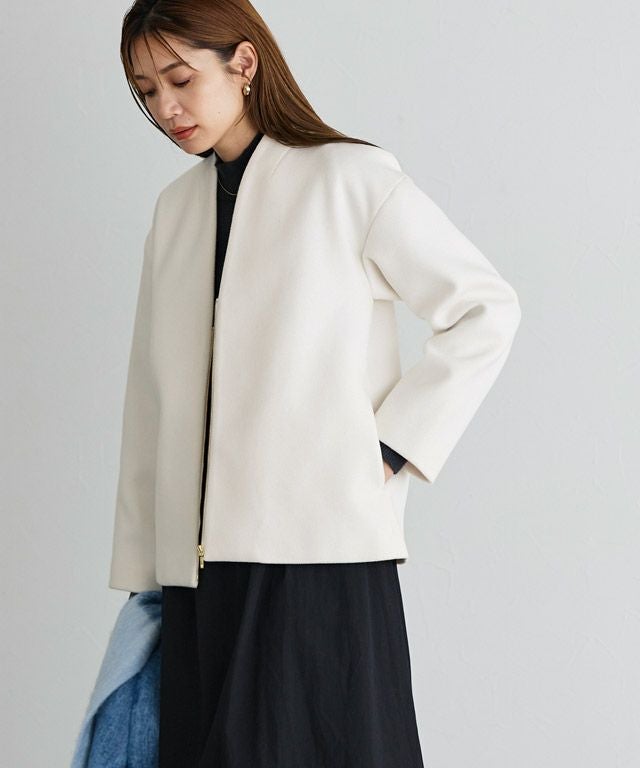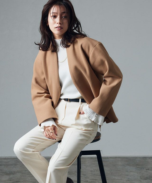 Vラインに仕上げたノーカラーが首元をすっきりと見せてくれ、タートルネックなどネックのあるデザインとも相性良く、大人な雰囲気に仕上げてくれる一枚です。ON/OFFどちらでも合わせやすいシンプルなディテールで、ショート丈なので低身長さんにもオススメ。
