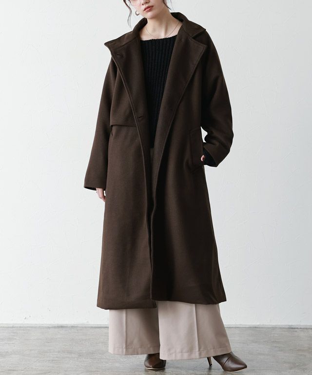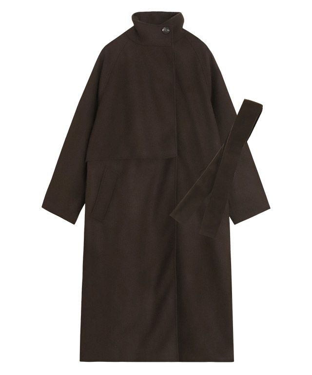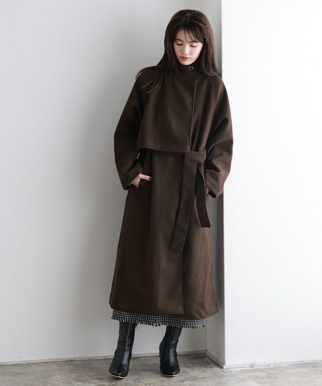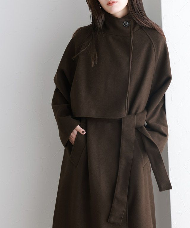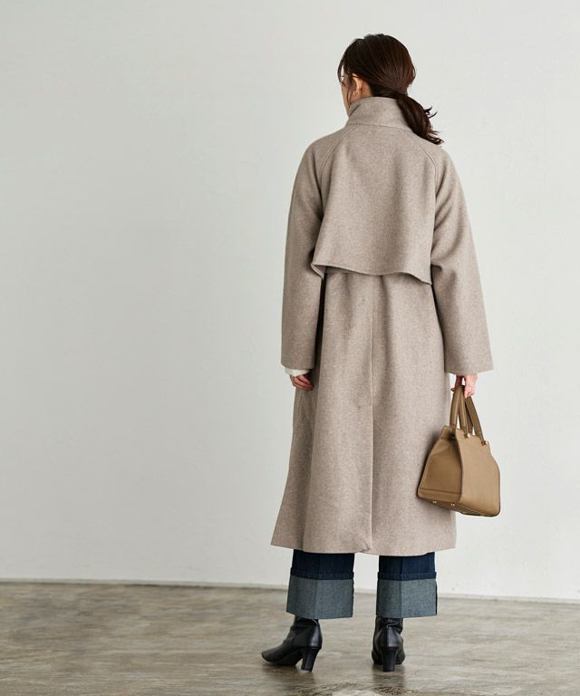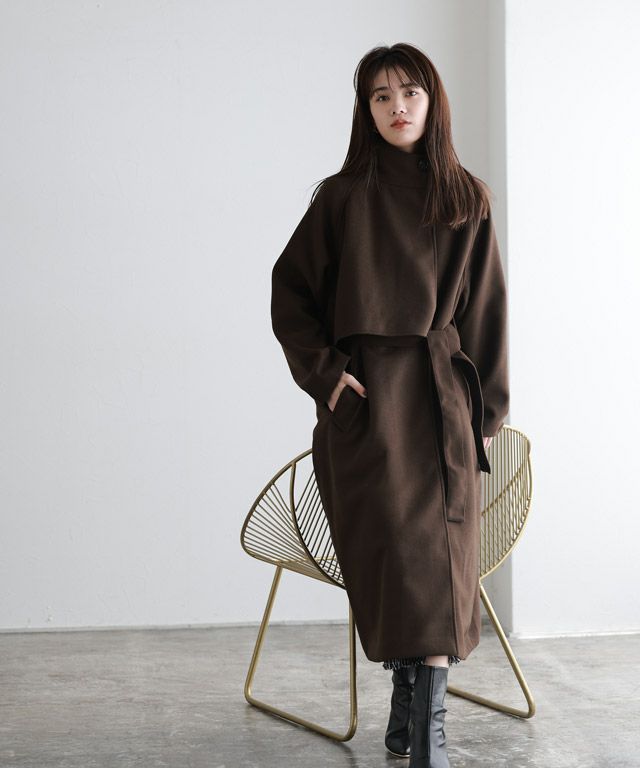 旬の装いを叶えるスタンドカラーとケープデザインで着映え感のあるコート。フロントの開閉で印象が変わり、着回しの幅が広がるところも魅力の一つです。