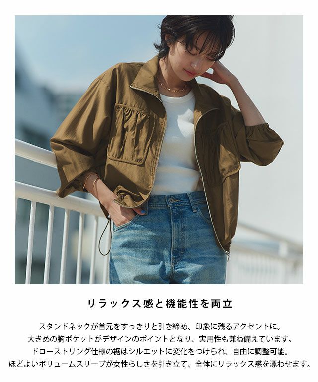 スタンドネックが首元をすっきりと引き締め、印象に残るアクセントに。大きめの胸ポケットがデザインのポイントとなり、実用性も兼ね備えています。ドローストリング仕様の裾はシルエットに変化をつけられ、自由に調整可能。ほどよいボリュームスリーブが女性らしさを引き立て、全体にリラックス感を漂わせます。
