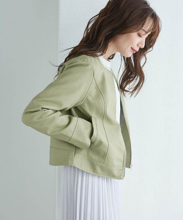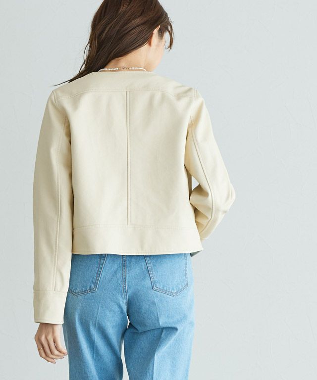 大人な印象に仕上げる“フェイクレザーノーカラージャケット”