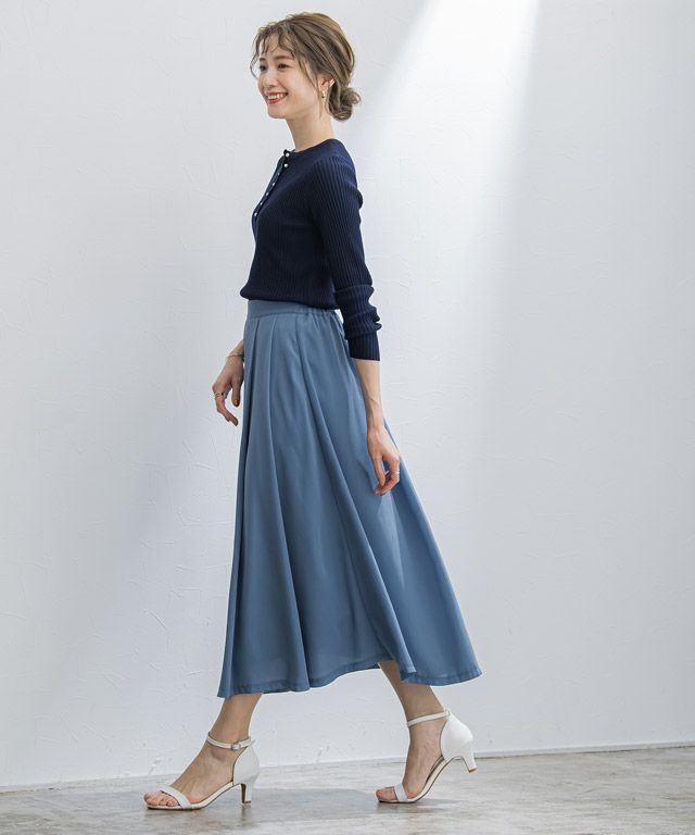 着丈はふくらはぎ下の丈感でした。ウエストはゴム仕様で着脱も楽にできます。たっぷりと生地を使っているので、ふんわりと広がるスカートです。 |