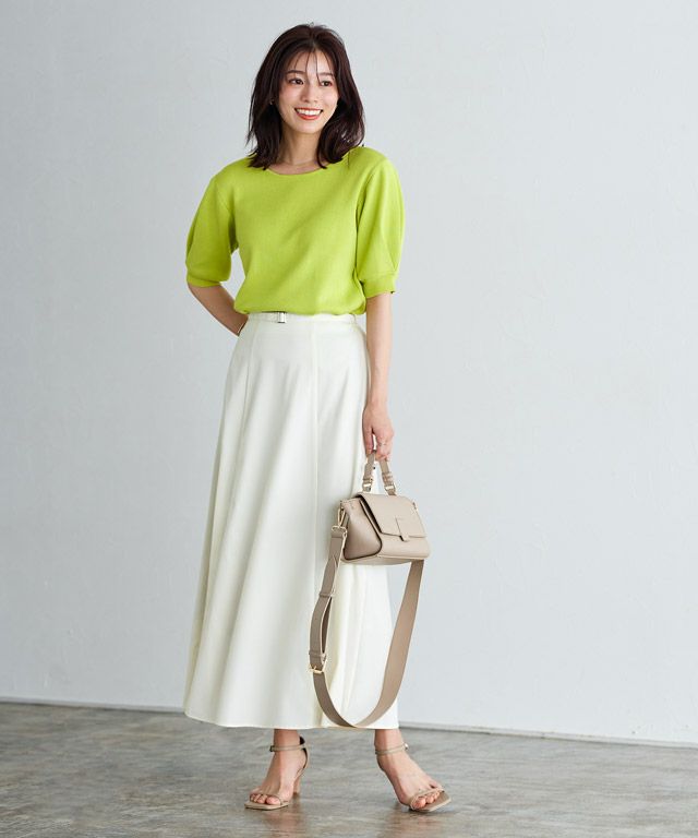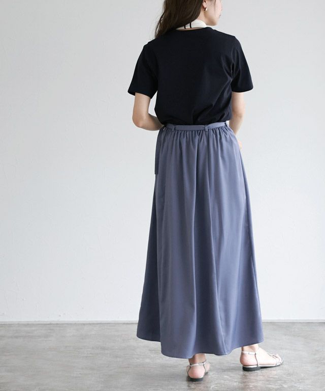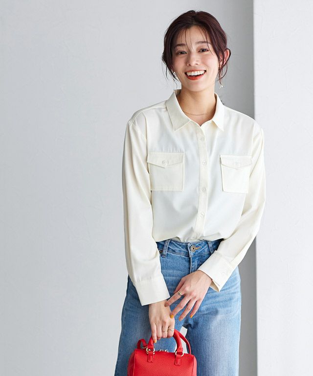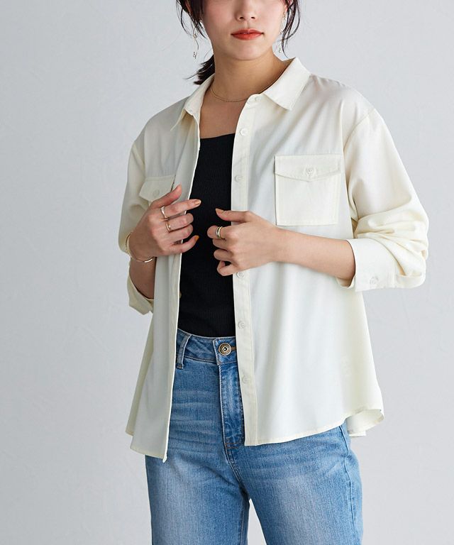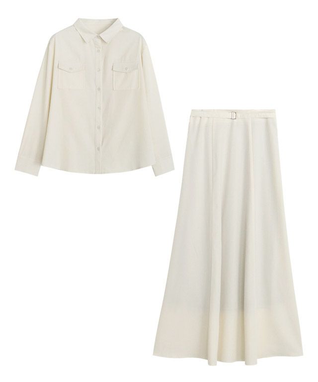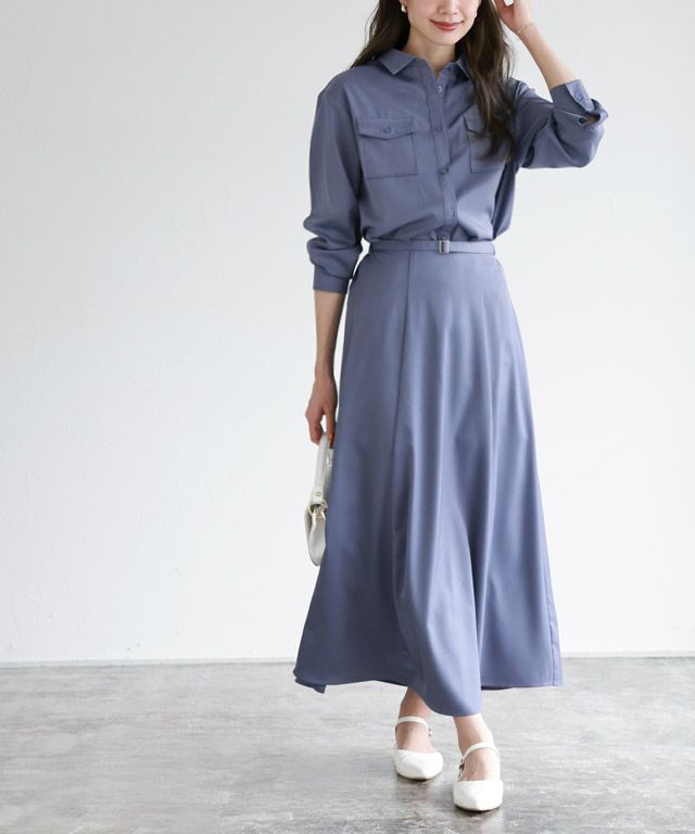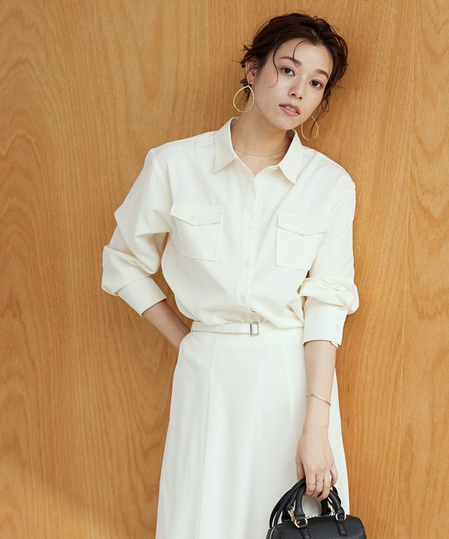 フラップポケットやシャツ襟がメンズライクなデザインながらも、とろみ素材で女性らしさ溢れるアイテム。スカートは広がりすぎないシルエットと細ベルトが華奢な印象に◎単品使いでも着回しやすいデザインです。