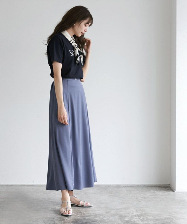 着丈は足首が見える丈感でした。ウエストは後ろがゴムでゆとりがあり、ヒップにはゆとりがあります。滑らかで上品な素材です。スカートの揺れ感が綺麗です。