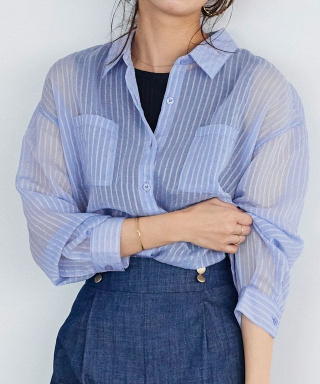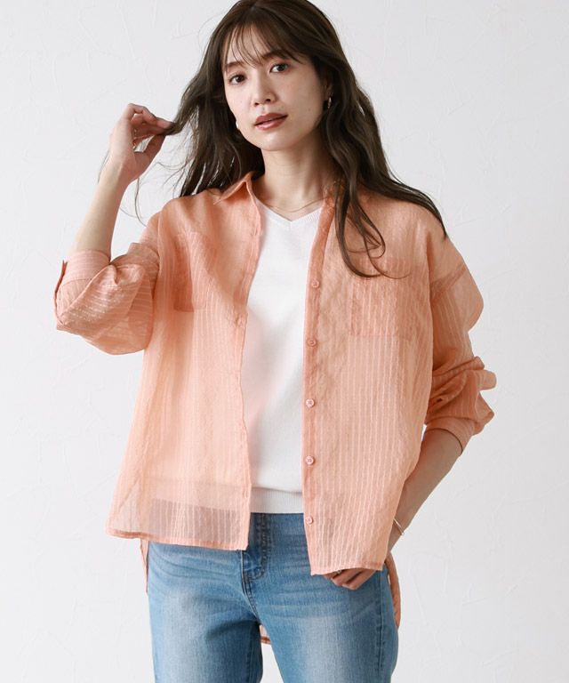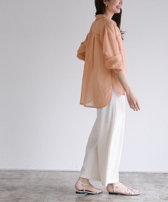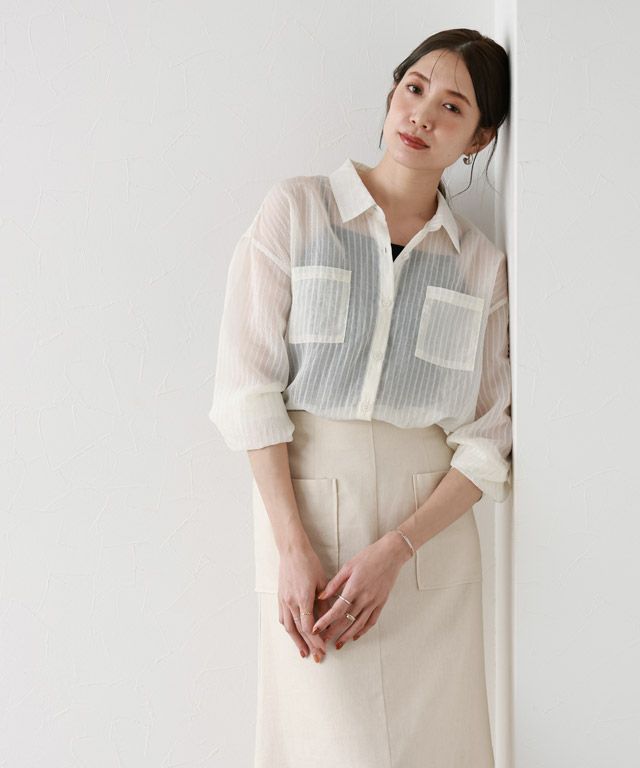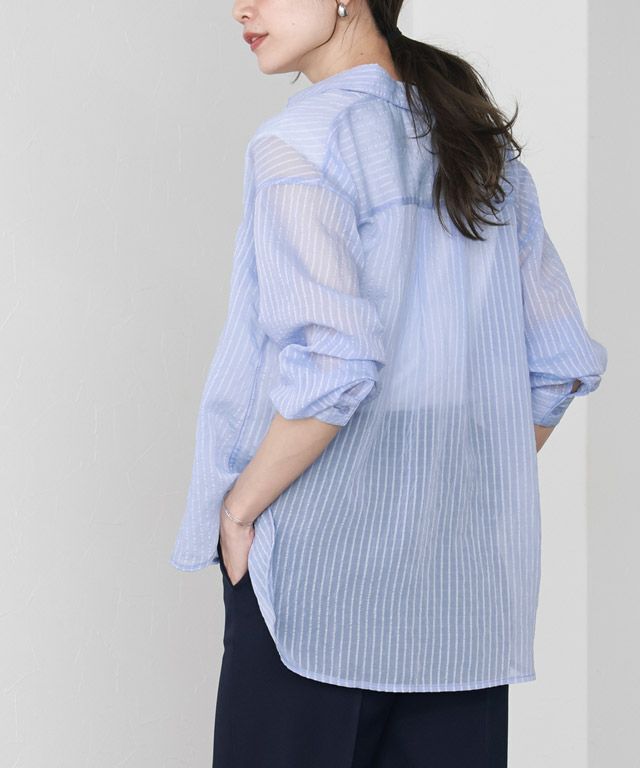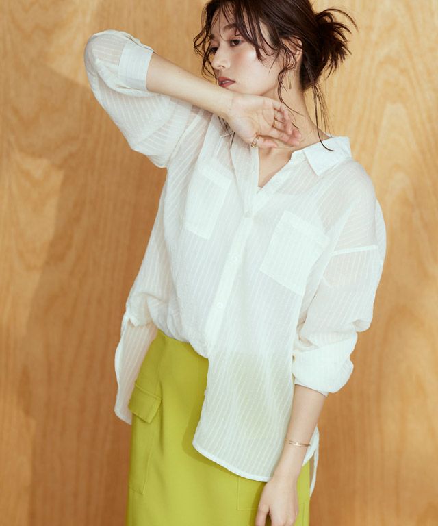 透け感のあるシアー素材が一気に旬な印象に。同色系のストライプ柄が主張しすぎず、程良いアクセントをプラスしてくれます。