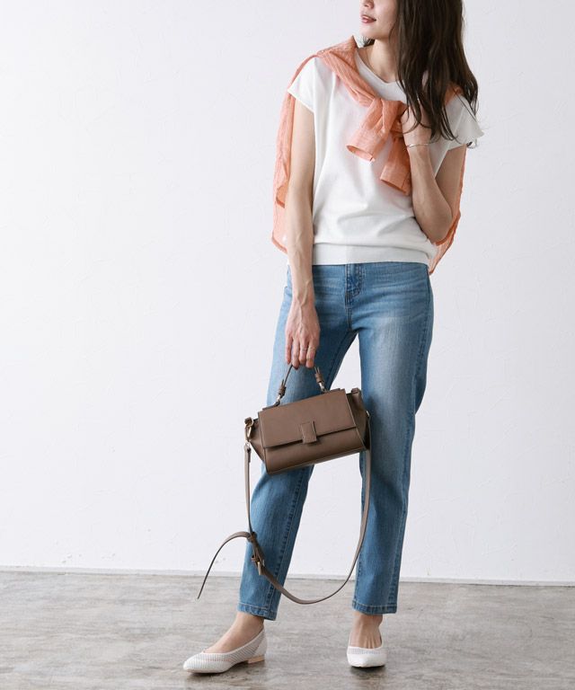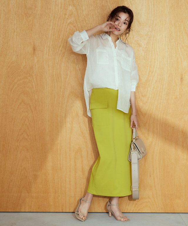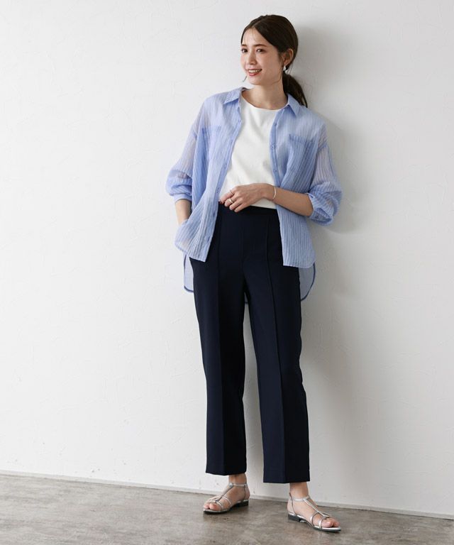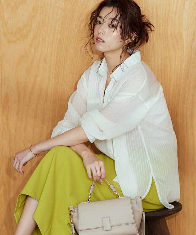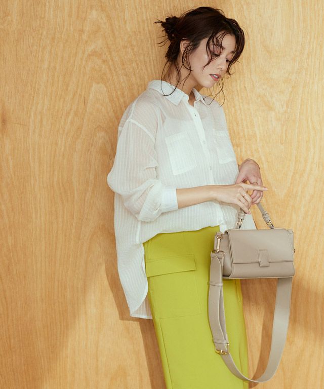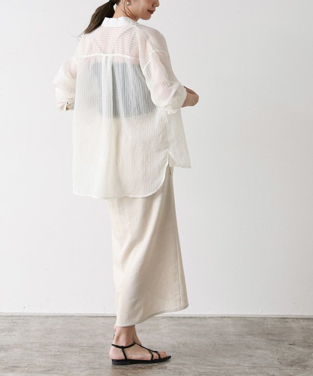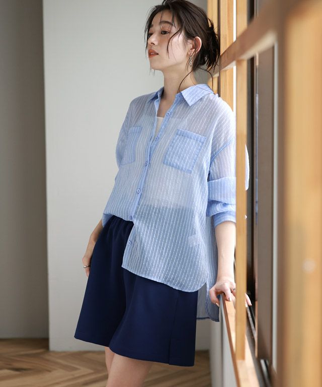 透け感のあるシアー素材が一気に旬な印象に。同色系のストライプ柄が主張しすぎず、程良いアクセントをプラスしてくれます。