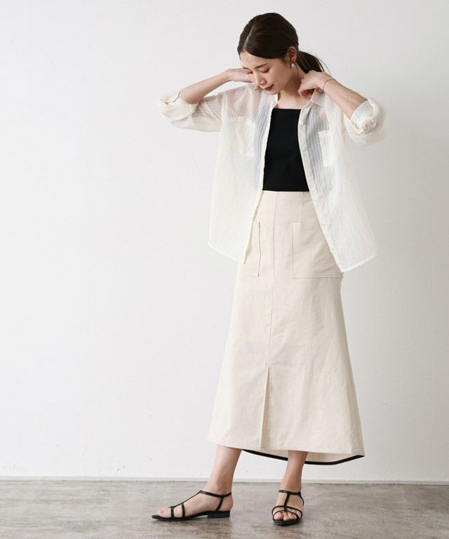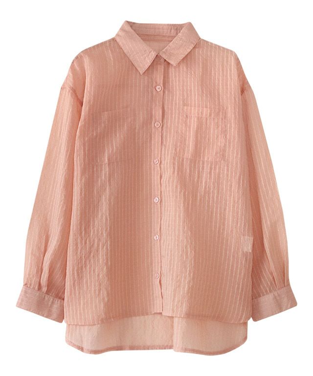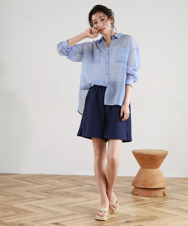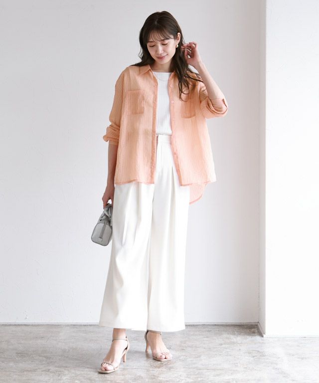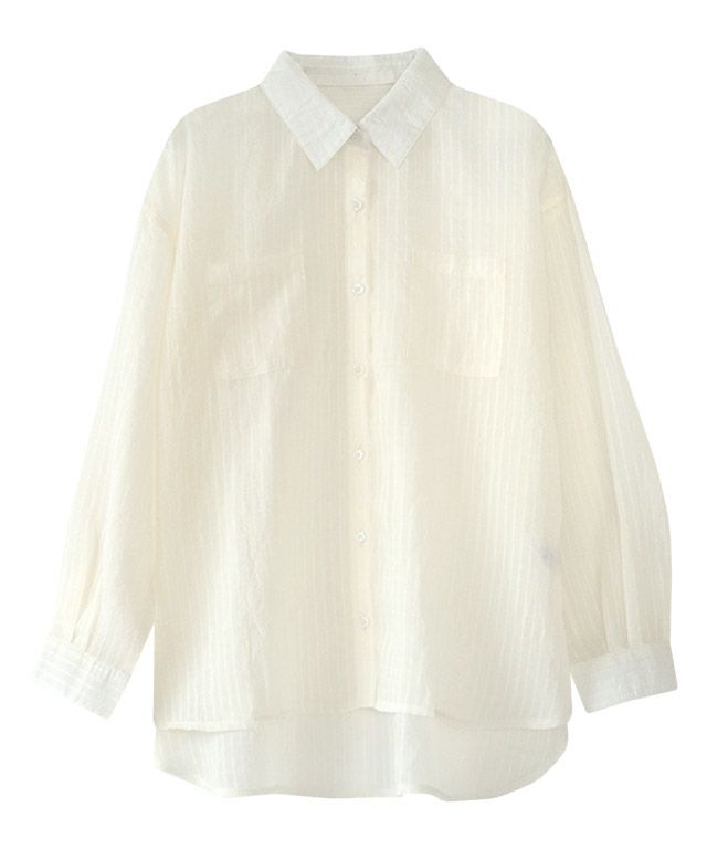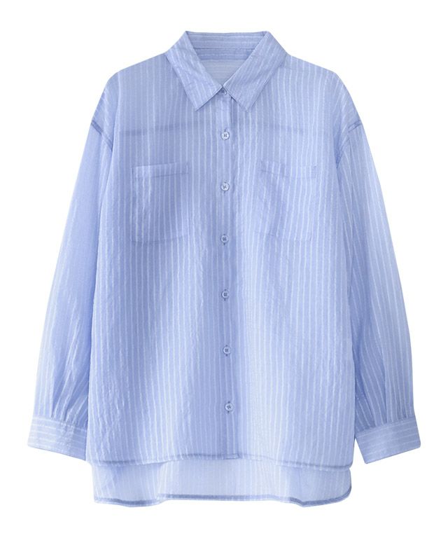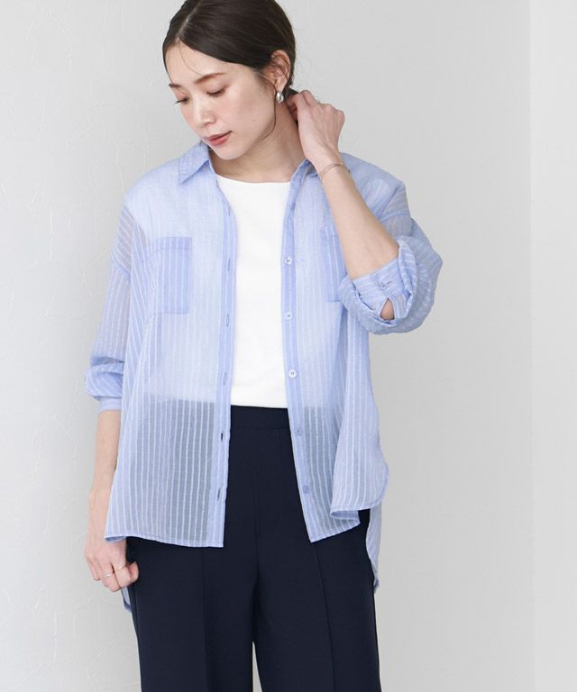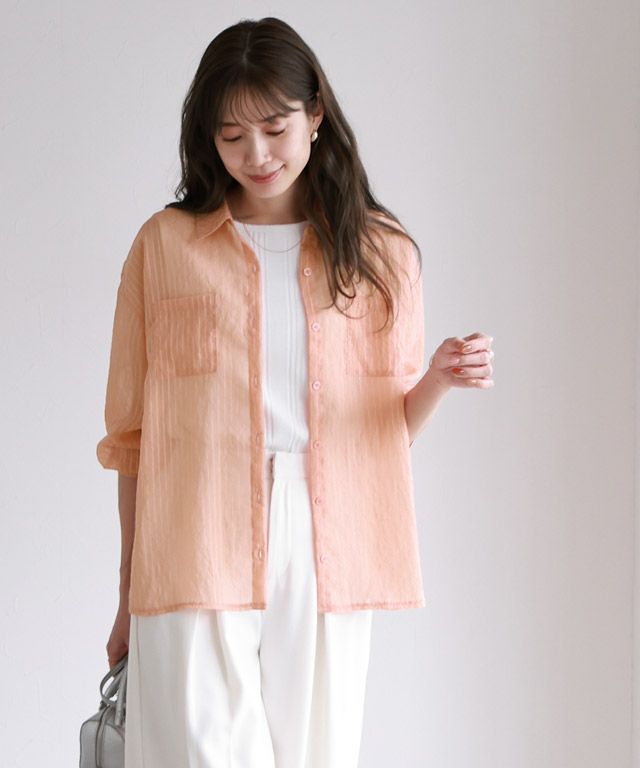 シンプルなオーバーサイズシャツですが、胸ポケットがワンポイントに。ややオーバーシルエットがこなれた雰囲気に仕上げてくれます。シアーシャツとしてはもちろん、前を開けて軽い羽織りとしても活躍。薄手の素材なので夏場の羽織りにもおすすめです。