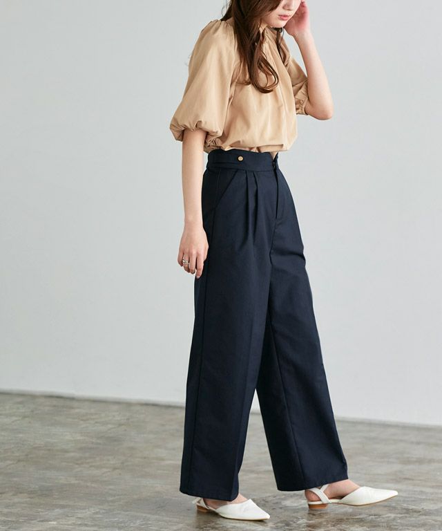 ウエストサイドのゴールドボタンが上品なアクセントになるパンツ。ハイウエストでもスリットを入れることで、すっきりとした印象に◎インスタイルはもちろん、アウトにしてもシンプルなタックパンツとして着回せるアイテムです。