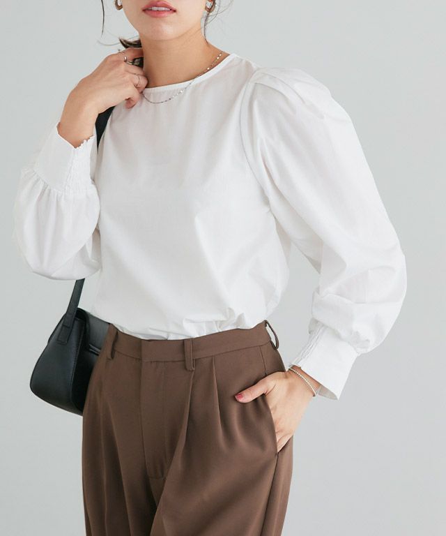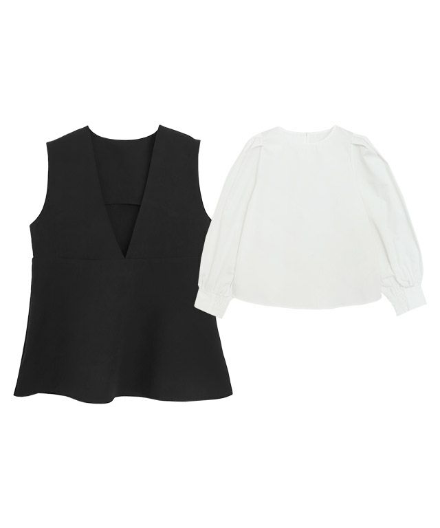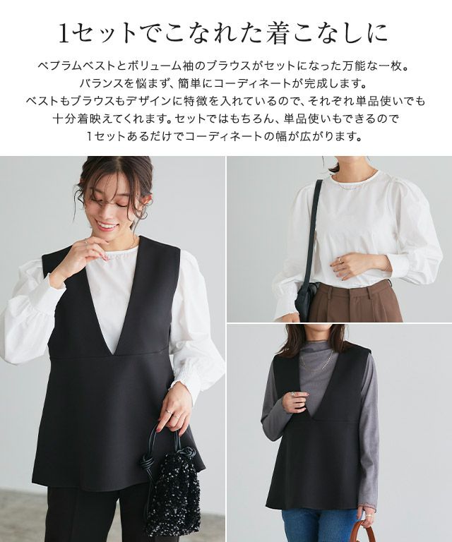 ペプラムベストとボリューム袖のブラウスがセットになった万能な一枚。 バランスを悩まず、簡単にコーディネートが完成します。 ベストもブラウスもデザインに特徴を入れているので、セットではもちろん 単品使いもできて、1セットあるだけでコーディネートの幅が広がります。