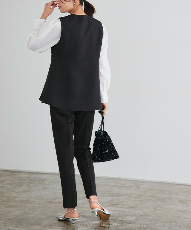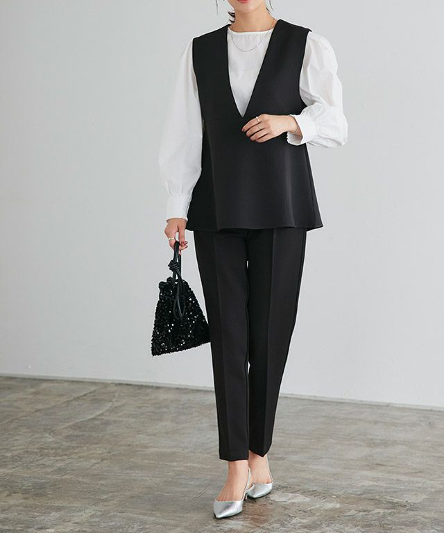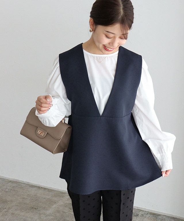 ベストは程良くつや感のある上品見えする素材を使用。ブラウスはハリ感のある綿混素材を使用し、セットできれいめにもカジュアルにも着回せるアイテム。