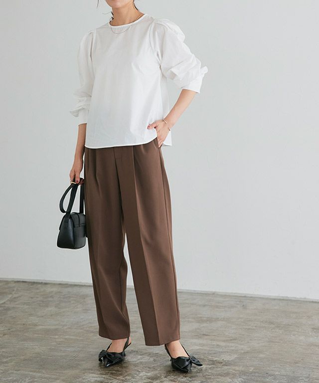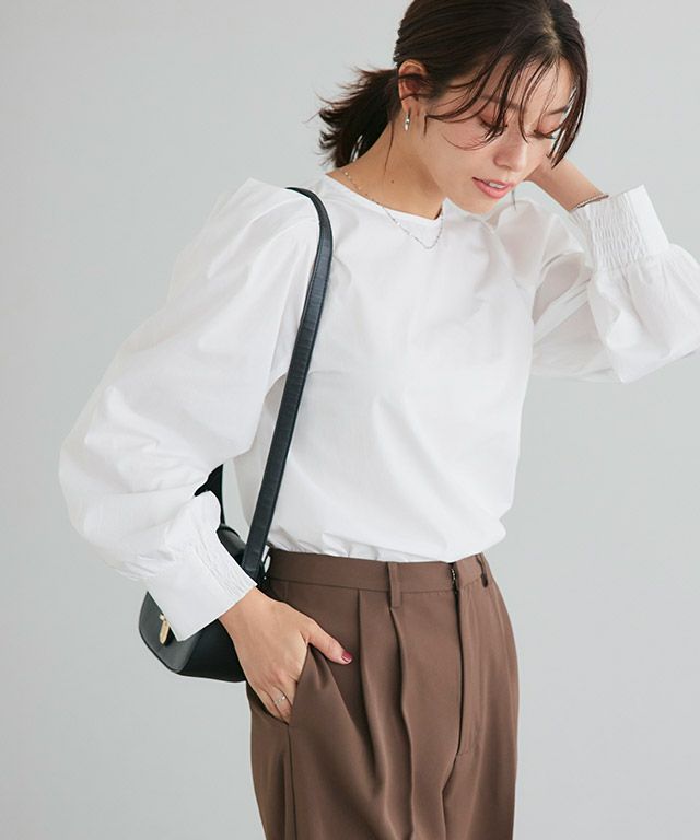 I ブラウス:着丈はお尻が半分隠れる丈感でした。袖丈は手の甲がほとんど隠れます。身幅は程よいゆとりがありました。さらっとした素材で軽い着心地です。窮屈感なく着用できます。