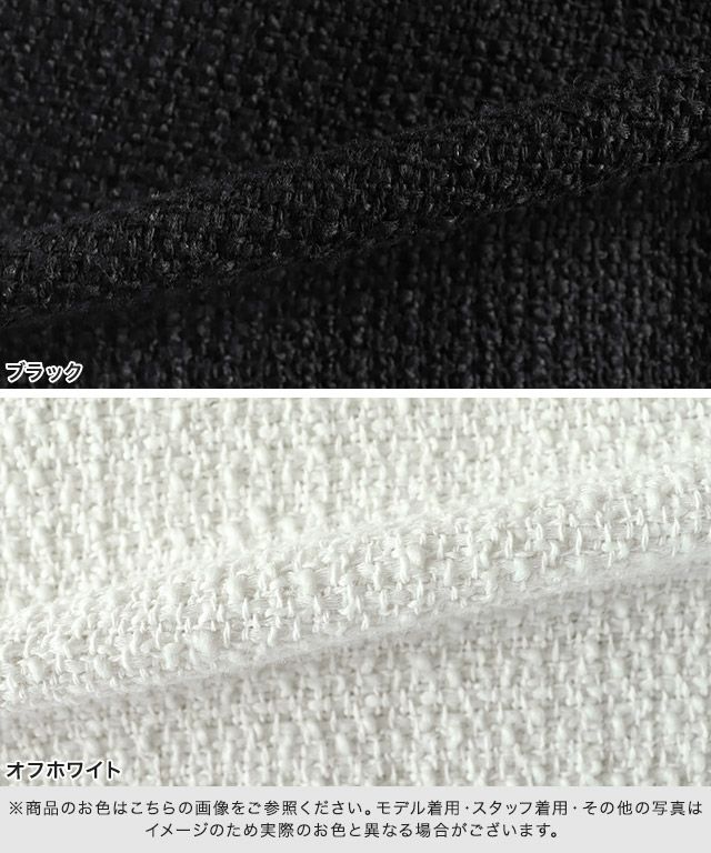 トレンドのツイード素材なので、女性らしい華やかさをプラスしてくれます。重厚感のある生地感で、ON/OFFどちらのスタイルでも着回しが可能な一枚。
