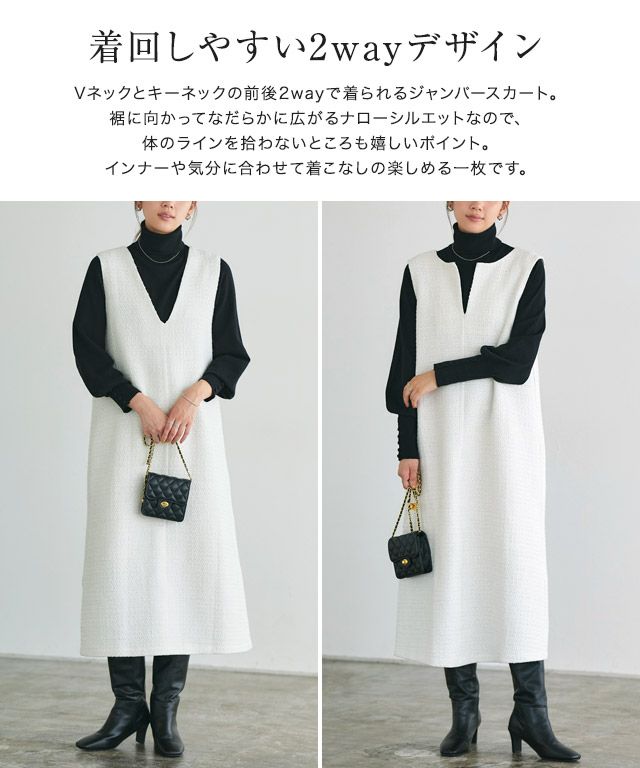 Vネックとキーネックの前後2wayで着られるジャンパースカート。裾に向かってなだらかに広がるナローシルエットなので、体のラインを拾わないところも嬉しいポイント。インナーや気分に合わせて着こなしの楽しめる一枚です。