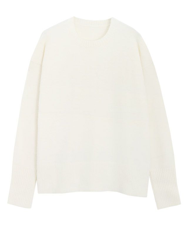 指穴デザインがトレンドライクな一枚。首元がすっきりと見えるクルーネックデザインと、レディライクな印象のVネックの選べる2typeも嬉しいポイントです。シャギー糸と引き揃えた編み地で、ふんわりと温かみのあるニット。袖や裾は長めのリブ仕様になっており、さりげないアクセントに。