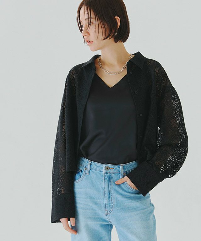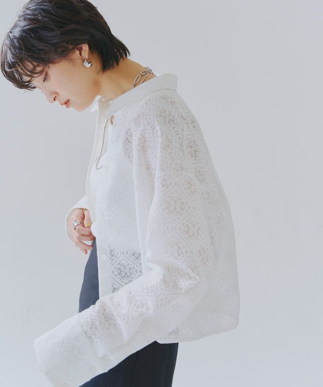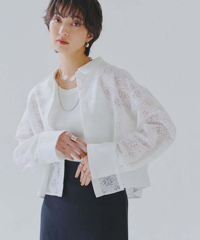 細やかな繊細なレース柄がフェミニンになりすぎず大人も着やすい素材感。綿混の程よい柔らかさが心地よく、綺麗なシルエットをキープします。さりげない透け感で軽やかな印象に導きます。