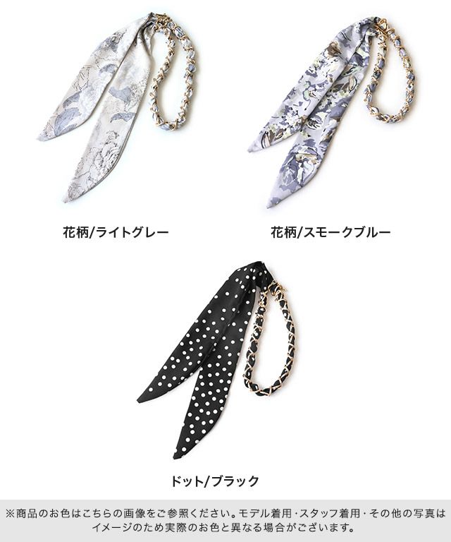 女性らしい柄が魅力のスカーフコンビチェーンネックレス。程よいボリュームが顔周りを華やかに見せ、大人フェミニンな印象に導きます。スカーフの先をタイ結びにして前後で着用も可能です。ネックレス以外にも、ヘアアクセ、バッグチャームとしてマルチに使えるのも嬉しいポイント。