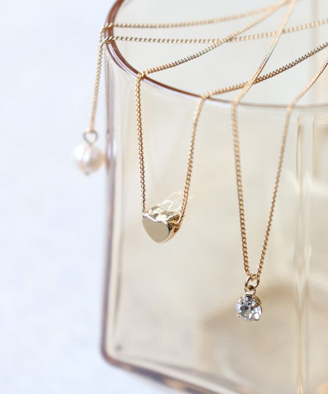 コーティングは高見えを叶える、ツヤのゴールドです。トップパーツはそれぞれ、メタルハートと一粒のガラスストーン、天然の良さを活かした淡水パールの選べる3typeでご用意。