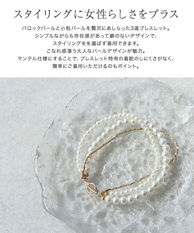 バロックパールと小粒パールを贅沢にあしらった3連ブレスレット。
