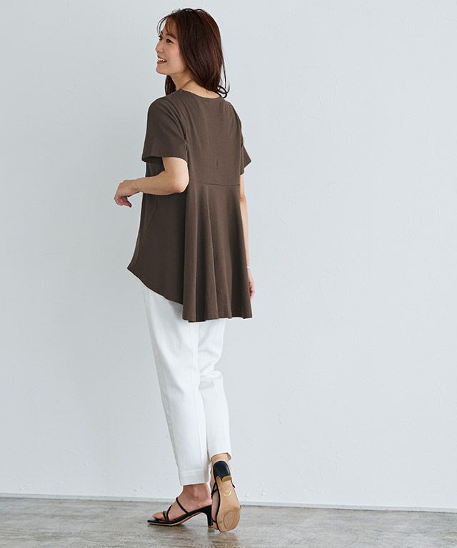 着丈に前後差をつけ、後ろにたっぷりと用尺を持たせることで、ふんわりとしたAラインを演出。どこから見てもサマ見えしてくれる一枚です◎