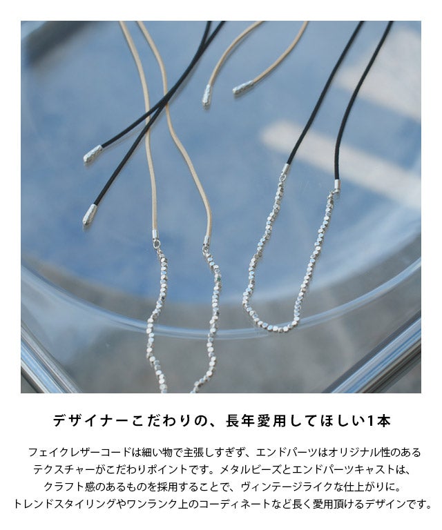コードの存在感をあえて主張し過ぎないもので、メタルビーズとエンドパーツキャストは、クラフト感のあるものを採用することで、ヴィンテージライクな仕上がりに。トレンドスタイリングにはもちろん、ワンランク上のコーディネートなど、長くご愛用頂けるデザインです。