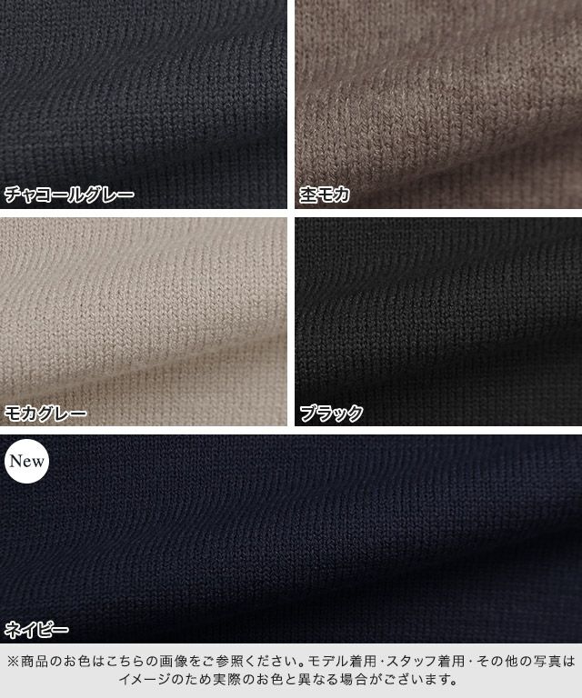 また、ニット製品は生産の過程上「生地を織る際の糸の継ぎ目」繊維の「混紡」、プレス加工、製品洗い加工によって形やサイズ(5cm前後)に誤差が生じる場合がございますが品質上の問題はございません。