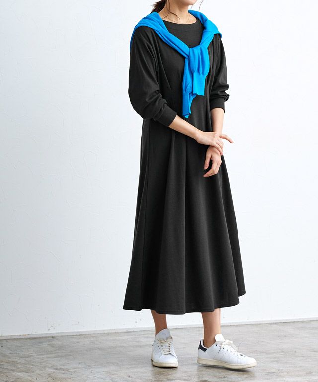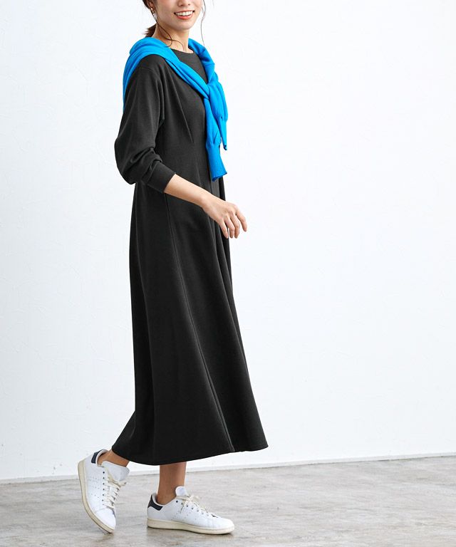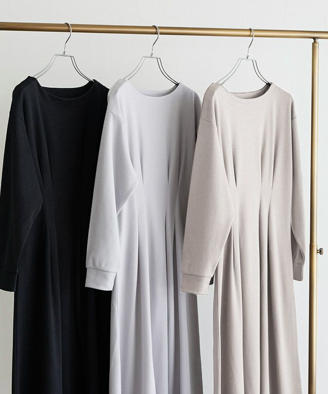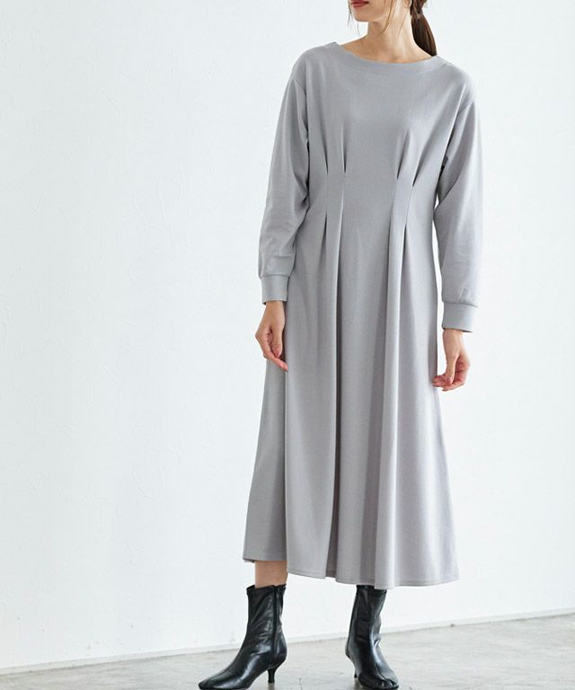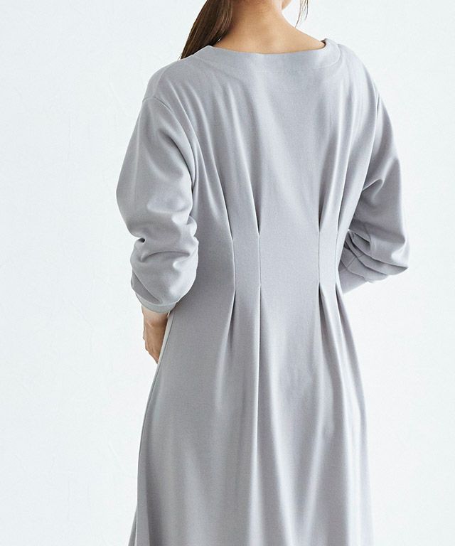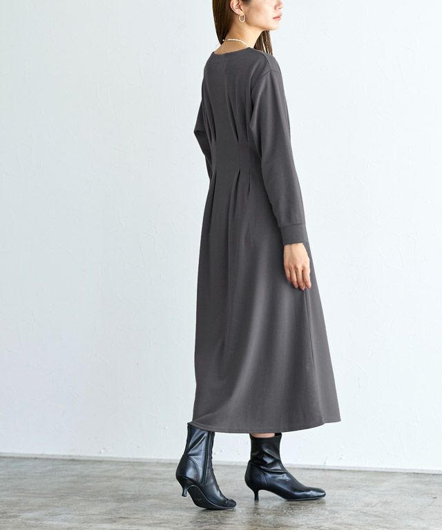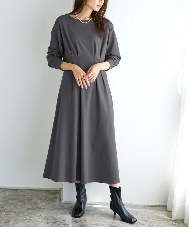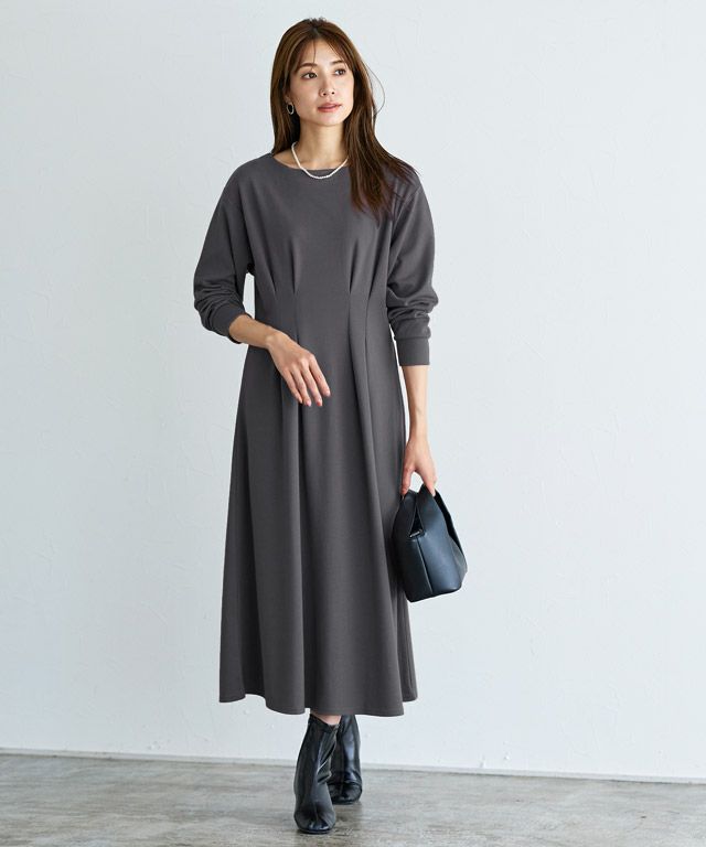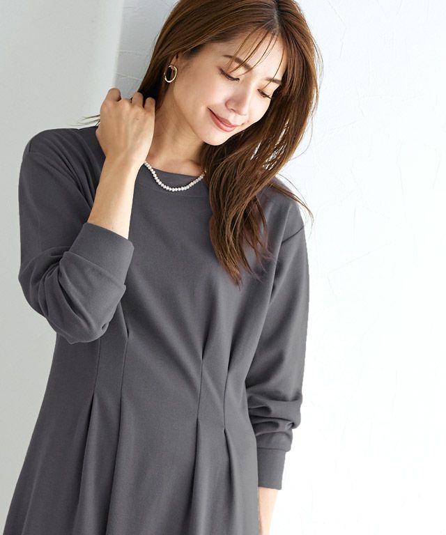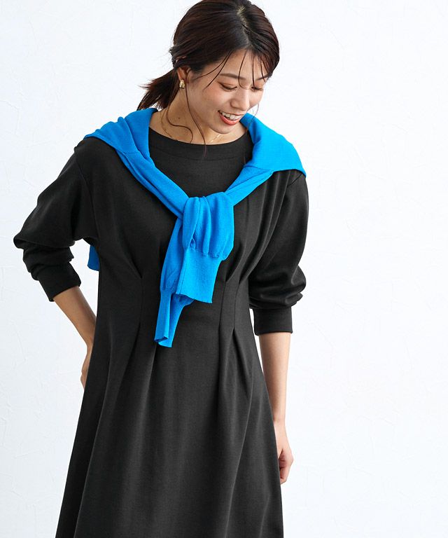 着るだけで女性らしさが惹き立つ美ラインタックワンピース。柔らかく肌触りの良い綿混のポンチカットソーを使用。年中着回しやすい素材です。