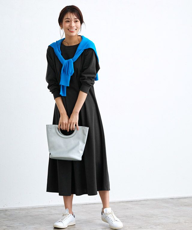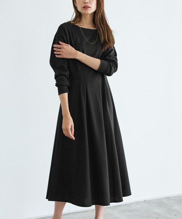 高めの位置でウエストマークされているので、脚長効果が期待でき、ボートネックが顔周りをすっきり見せてくれます。