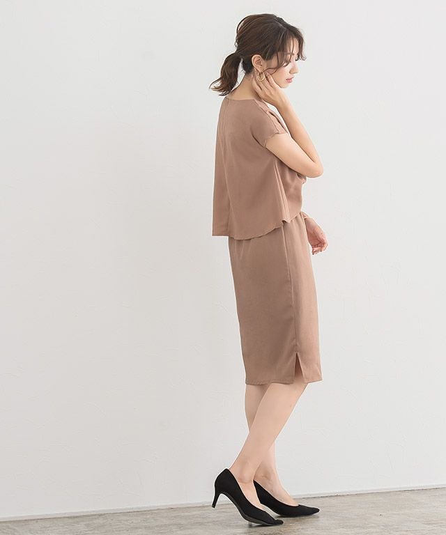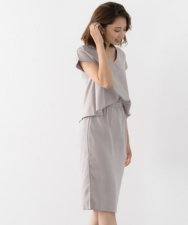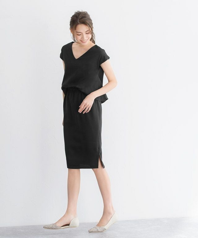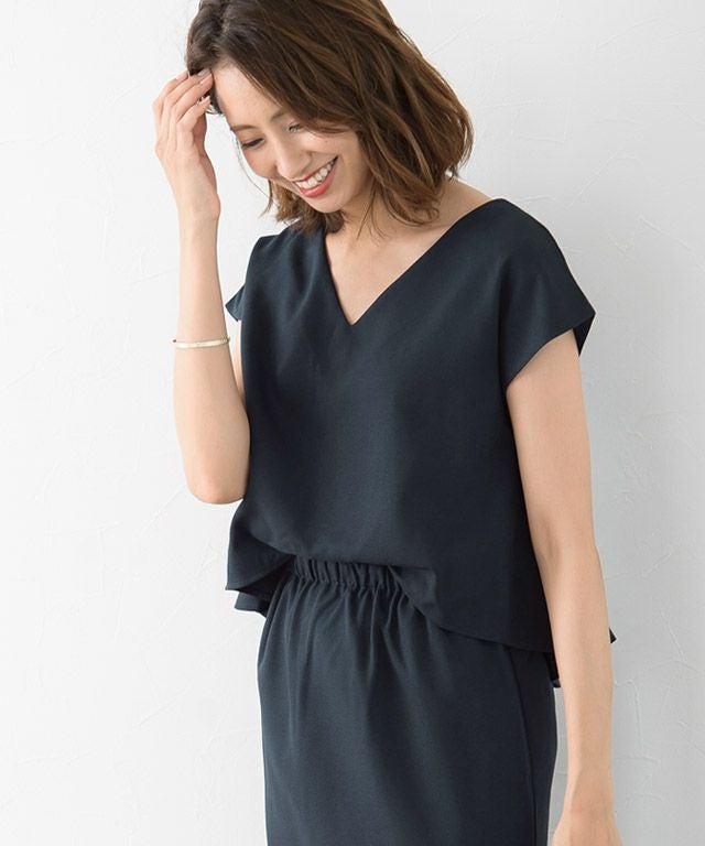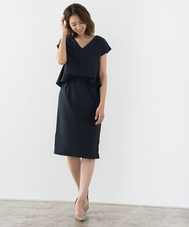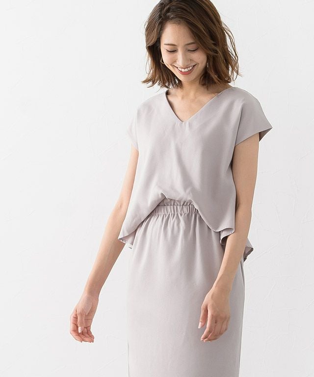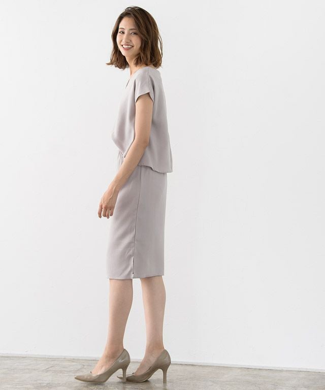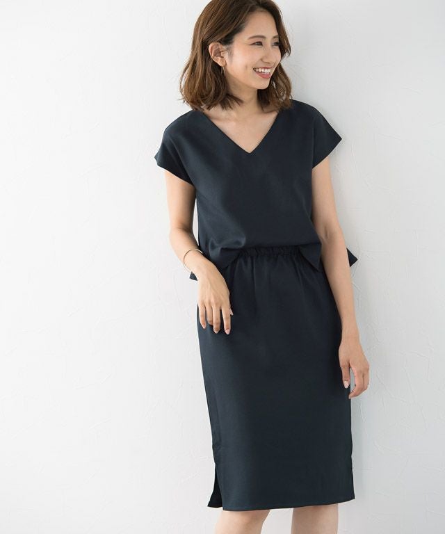 顔周りをすっきりと見せる緩やかなVネックや、シルエットを拾いすぎないタイトスカートが、女性らしさを演出してくれます。
