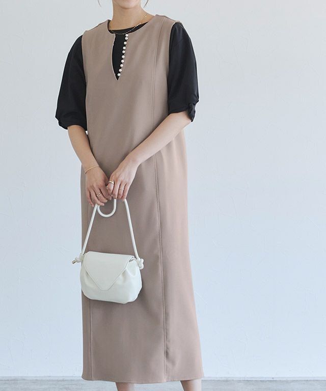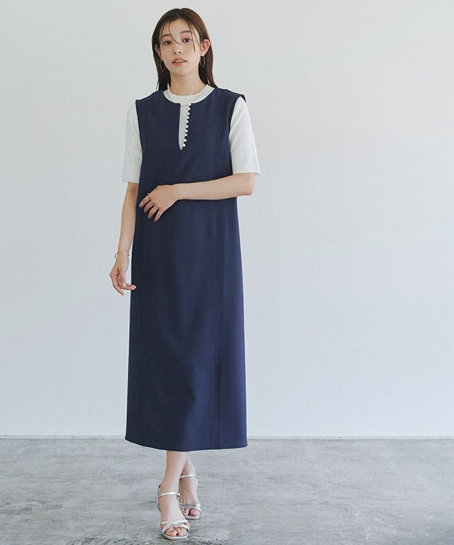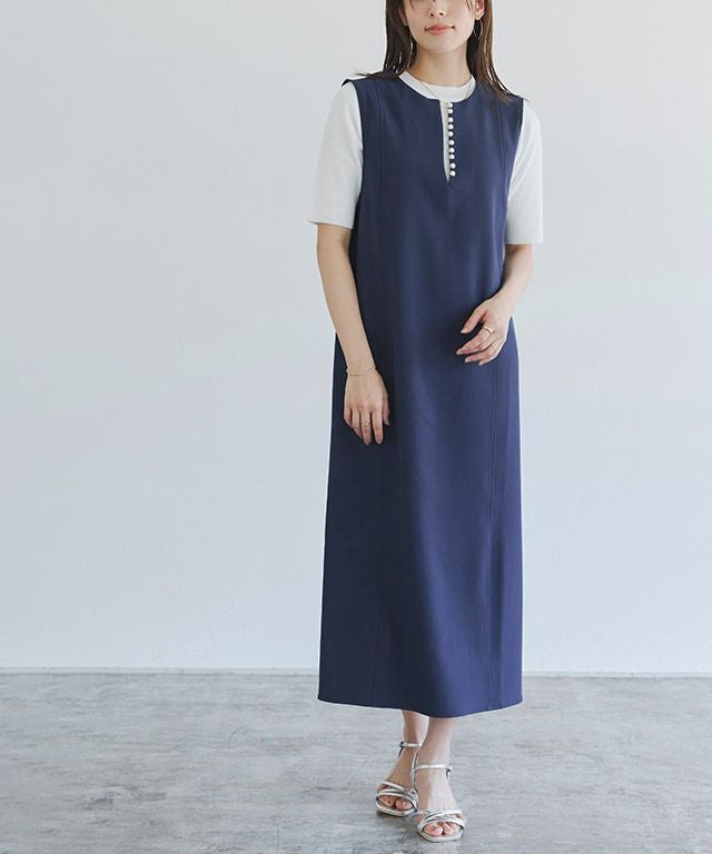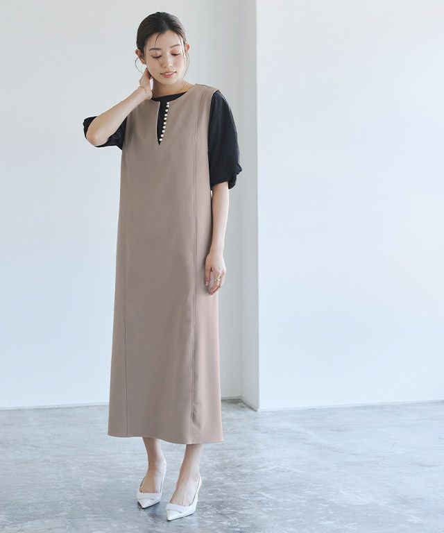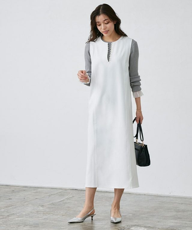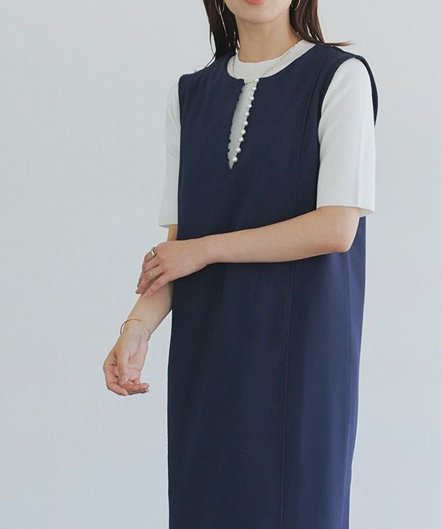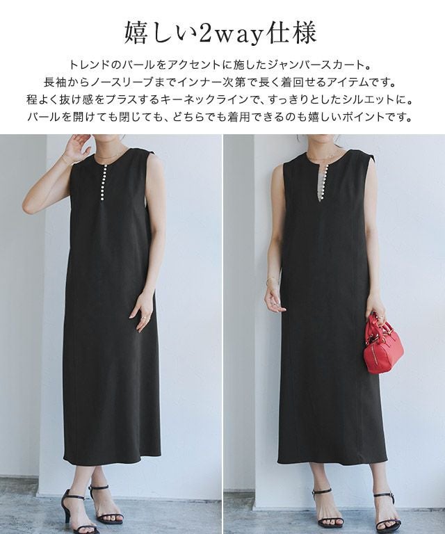 トレンドのパールをアクセントに施したジャンパースカート。長袖からノースリーブまでインナー次第で長く着回せるアイテムです。程よく抜け感をプラスするキーネックラインで、すっきりとしたシルエットに。パールを開けても閉じても、どちらでも着用できるのも嬉しいポイントです。