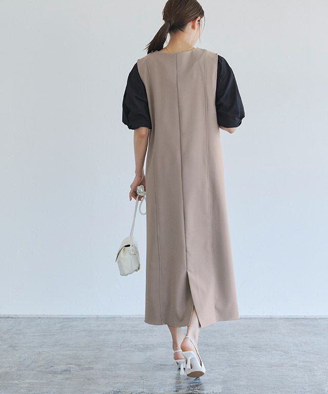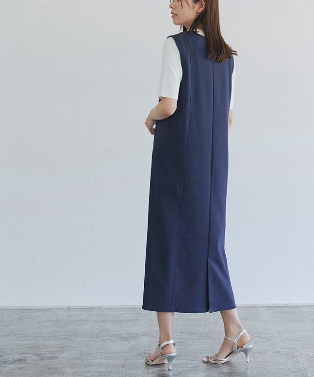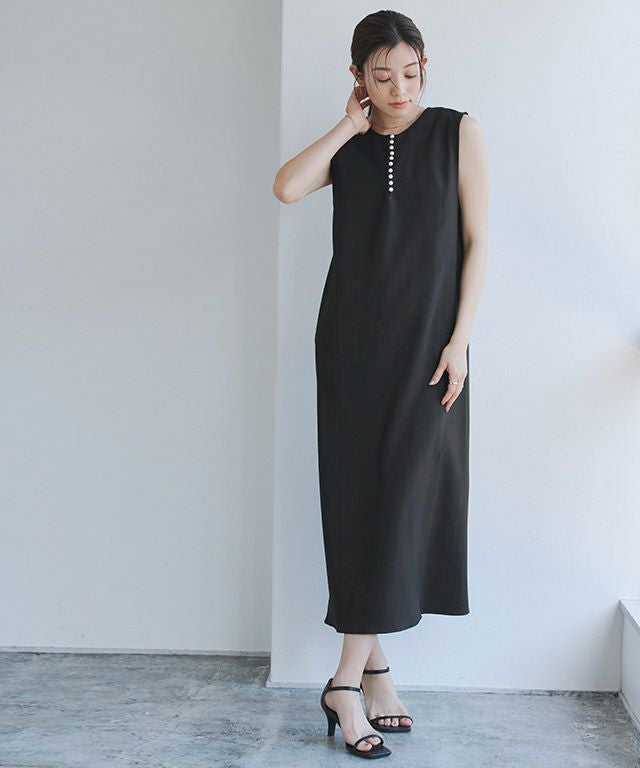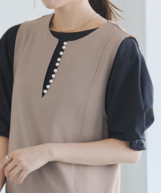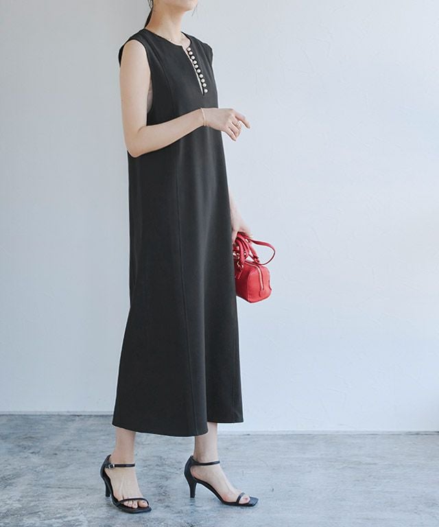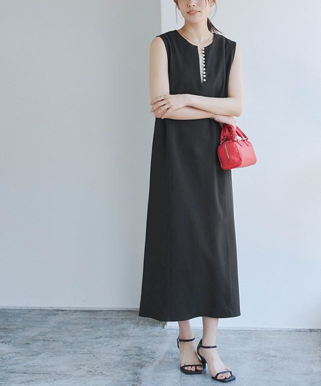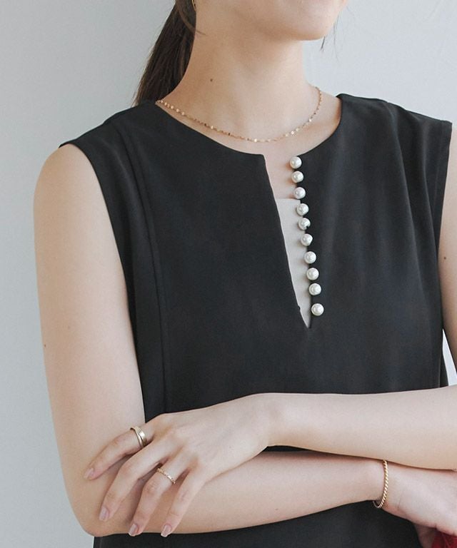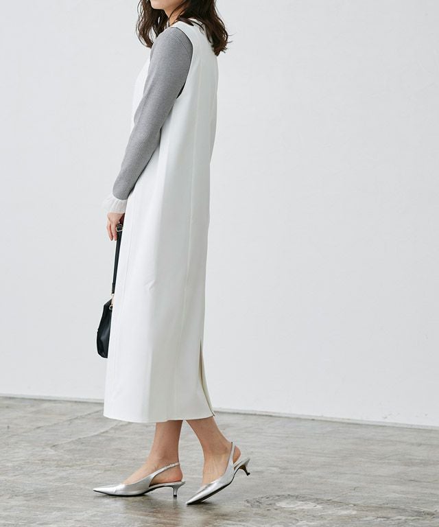 トレンドのパールをアクセントに施したジャンパースカート。長袖からノースリーブまでインナー次第で長く着回せるアイテムです。程よく抜け感をプラスするキーネックラインで、すっきりとしたシルエットに。パールを開けても閉じても、どちらでも着用できるのも嬉しいポイントです。