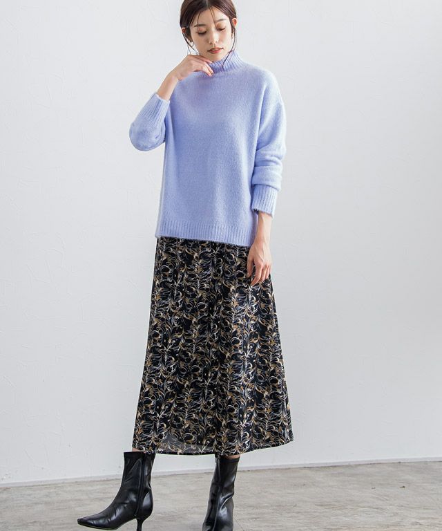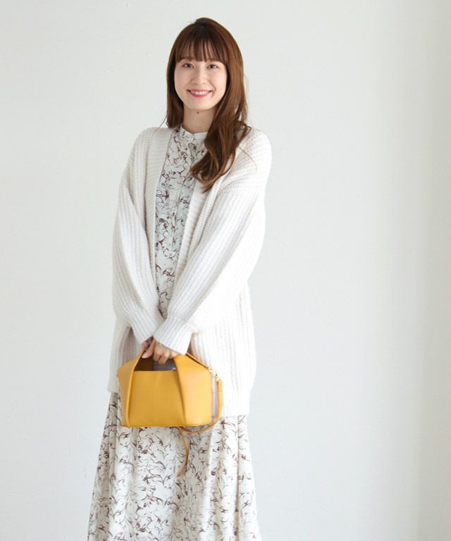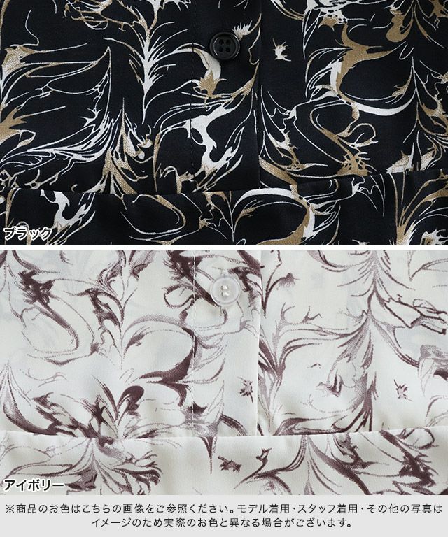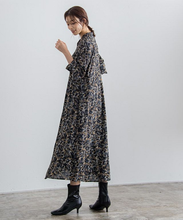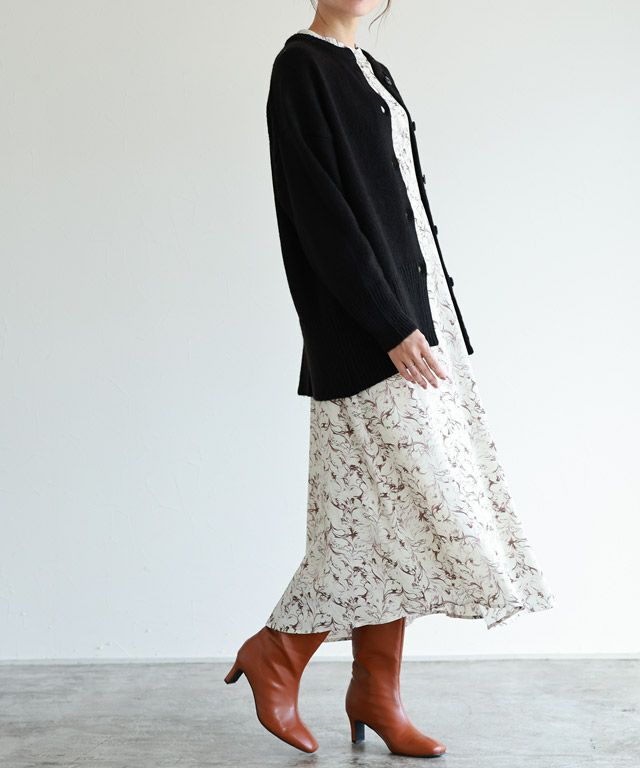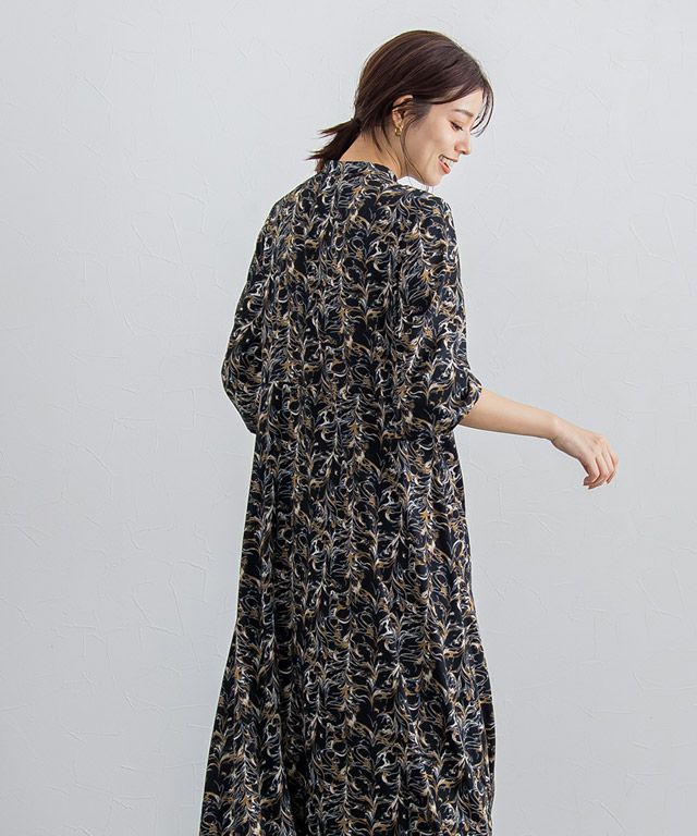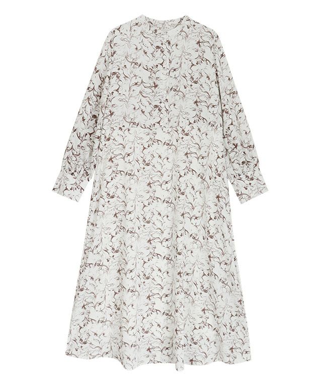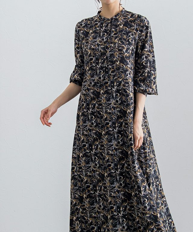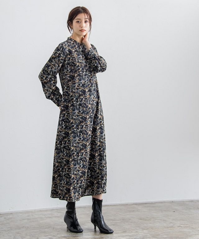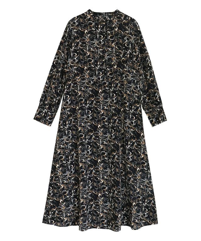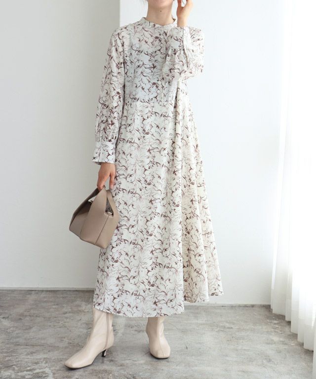 柄ワンピースでもフェミニンになりすぎず、大人な雰囲気に仕上げてくれるニュアンス柄。ウエストに切り替えを入れることでメリハリのあるスタイルに。バンドカラーで身頃はすっきりめに仕上げているのでニットやベストなどとレイヤードし、スカート見えするスタイリングも◎
