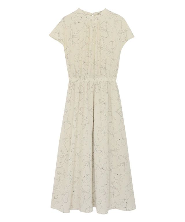 ウエストギャザーでふんわりと広がる女性らしいデザイン。バンドカラーがきちんと感とクラシカルなアクセントをプラスします。フレンチスリーブで腕周りもさりげなくカバーしてくれるところも魅力の一つ。ウエスト総ゴムで楽な着心地です◎