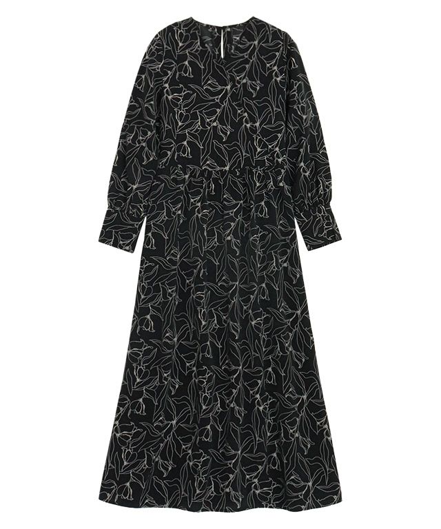 花柄でもワントーンの花柄にすることで、大人でも着こなしやすいデザインに。カシュクールデザインで女性らしい印象へと導いてくれ、ウエストから広がるフレアラインと、すっきりとしたスリットカフスが大人っぽい雰囲気に。