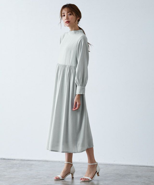 L 着丈はふくらはぎ真ん中の丈感でした。袖丈は手首ちょうどです。身幅は程よいゆとりがありました。滑らかで落ち感のある素材です。前後着用可能なので、その日の気分で雰囲気を変えられます。