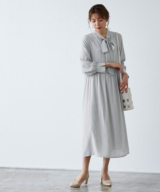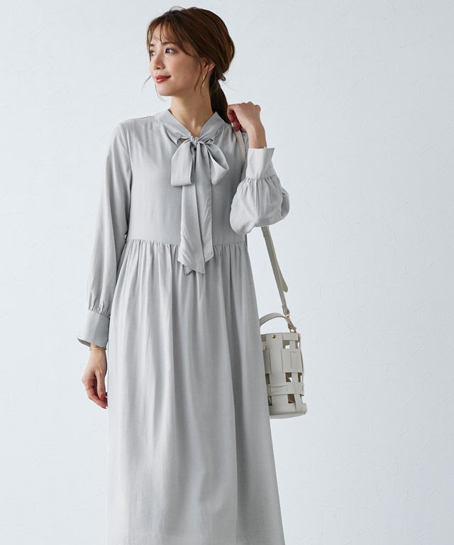フロントリボンでクラシカルな印象、バックリボンで上品な印象の前後2wayで着用できるワンピース。シーンや合わせるアイテムによって着回しを楽しめます。肌寒い時期はジャケットやジレ、ベストなどの重ね着がおすすめ。春は一枚でも着映えるデザインワンピースです。