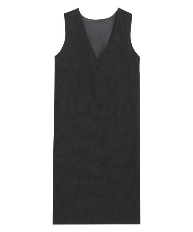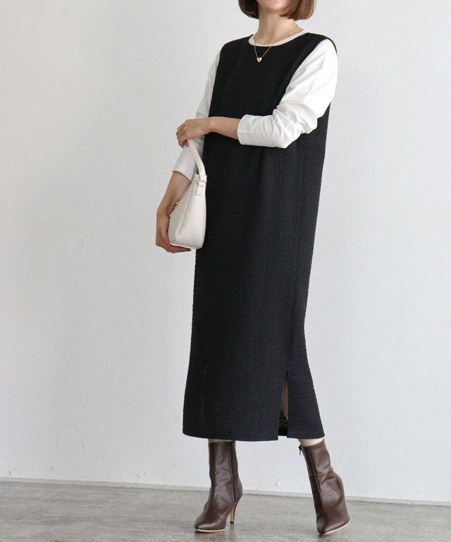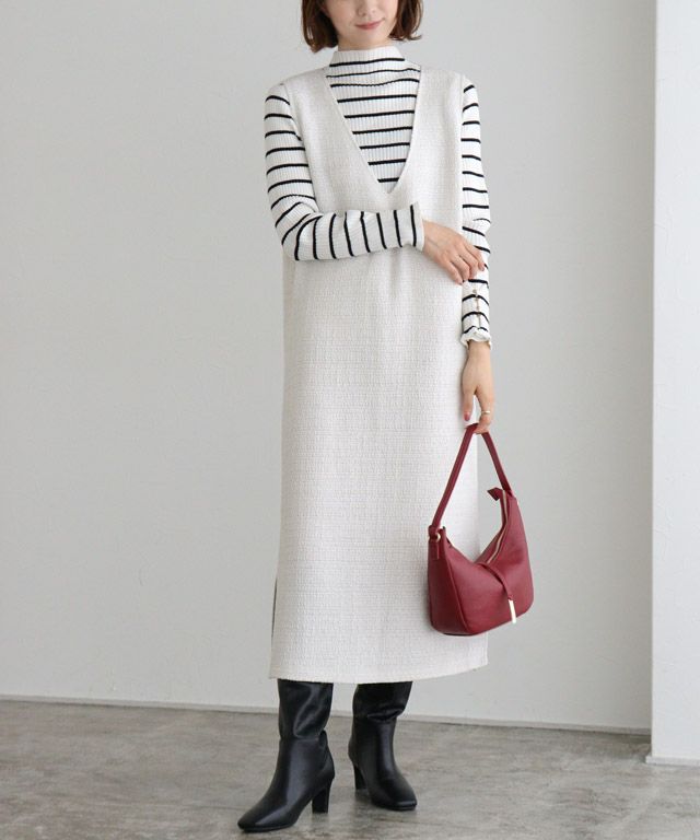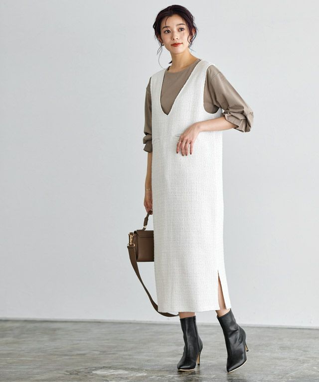 トレンドのツイード素材で仕上げたジャンパースカート。長袖からノースリーブまでインナー次第で長く着回せるアイテムです。深くシャープなカットのネックラインで、すっきりとしたシルエットに。前後でも着用できるのも嬉しいポイントです。