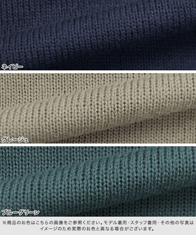 また、ニット製品は生産の過程上「生地を織る際の糸の継ぎ目」繊維の「混紡」、プレス加工、製品洗い加工によって形やサイズ(5cm前後)に誤差が生じる場合がございますが品質上の問題はございません。