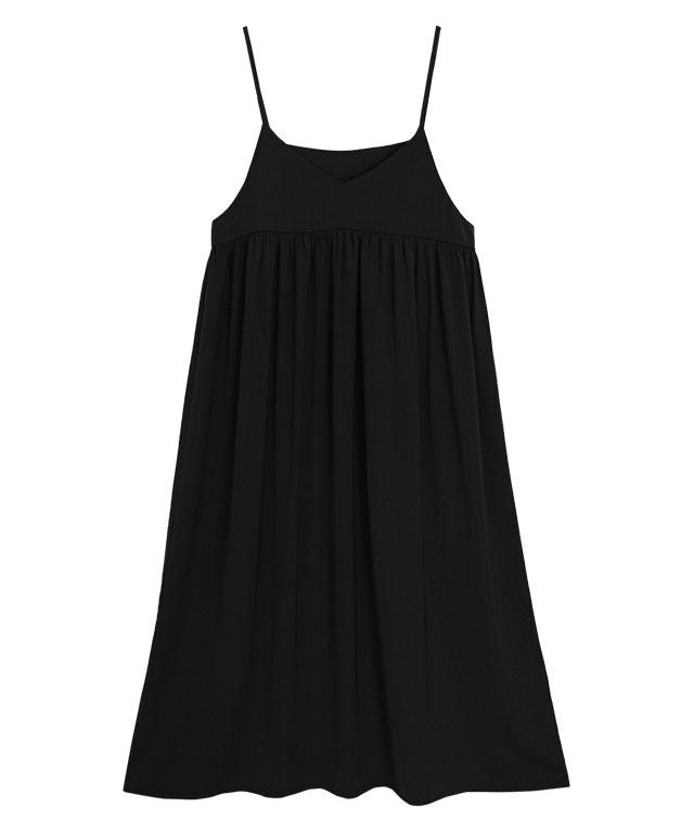 贅沢なギャザーデザインと華奢なストラップが女性らしいシルエットを叶えます。着るだけで存在感のある一着。インナー次第でロングシーズン活躍が期待できる主役級ワンピースです。