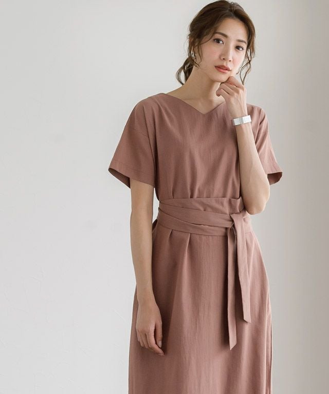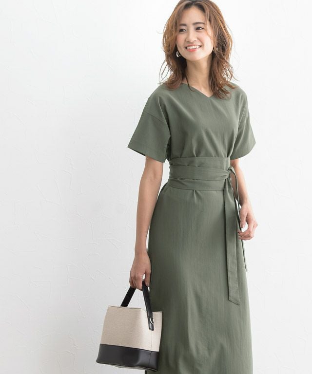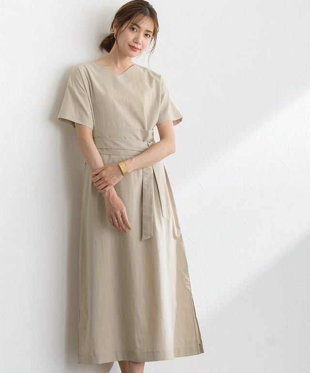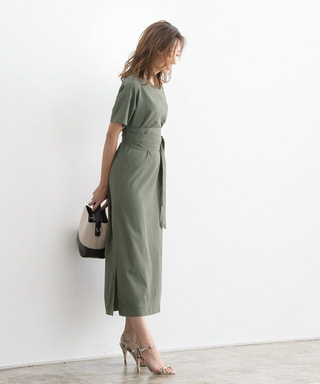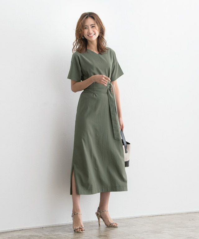 着丈はベルトなしで足首が隠れる丈感です。スリットはふくらはぎ上の辺りまでありました。袖丈は肘の少し上程度です。清涼感のある生地です。ベルトでウエストマークすれば、雰囲気が変わります◎バスト、ウエスト周りなどゆとりがありました。(Mサイズ)