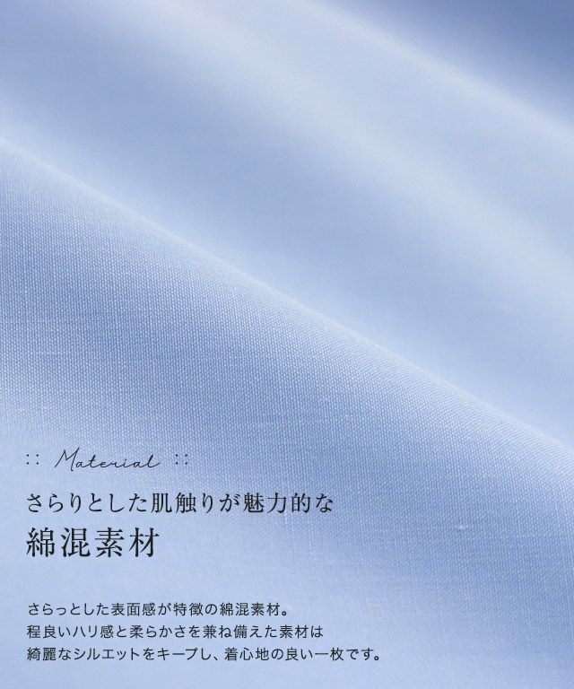 さらっとした表面感が特徴の綿混素材。程良いハリ感と柔らかさを兼ね備えた素材は綺麗なシルエットをキープし、着心地の良い一枚です。