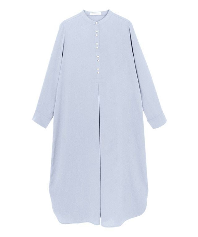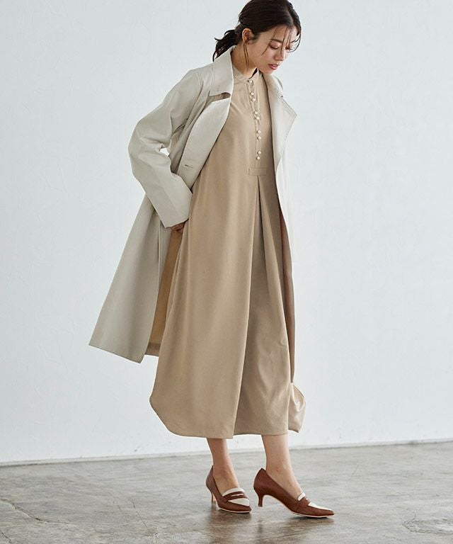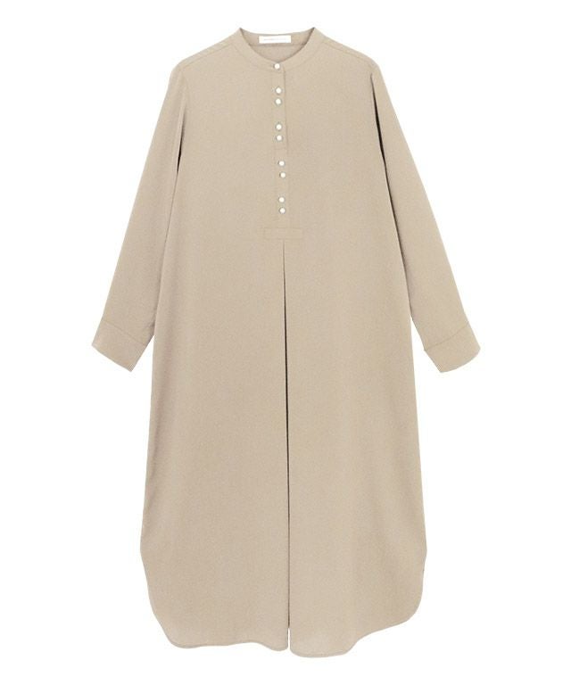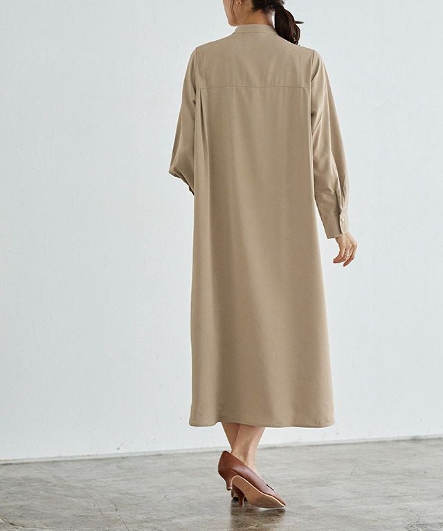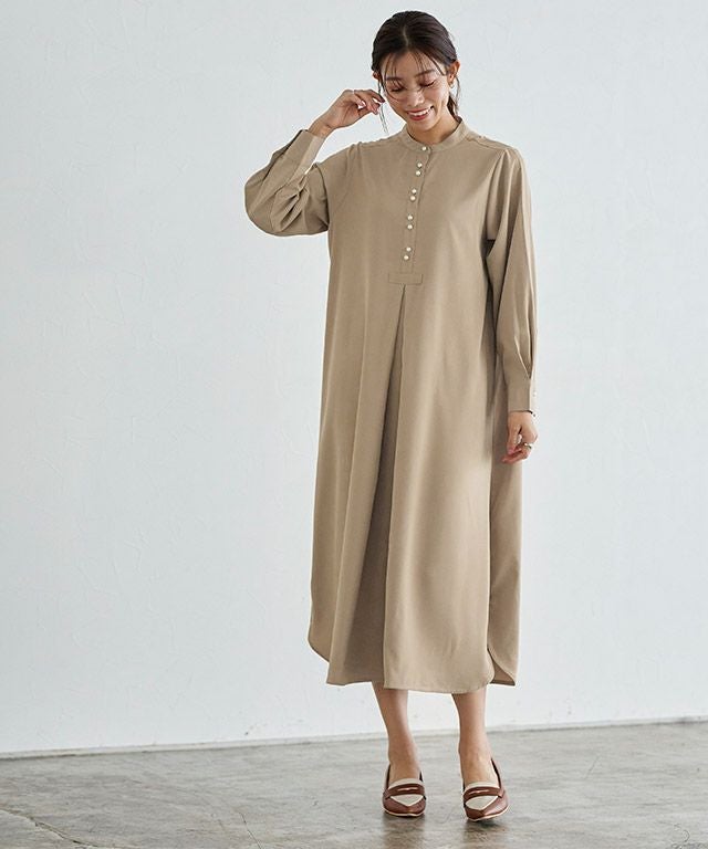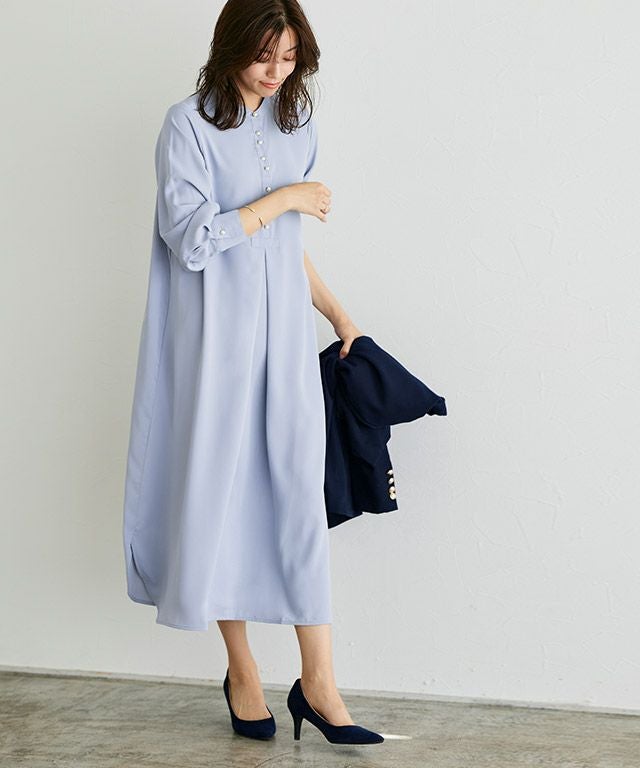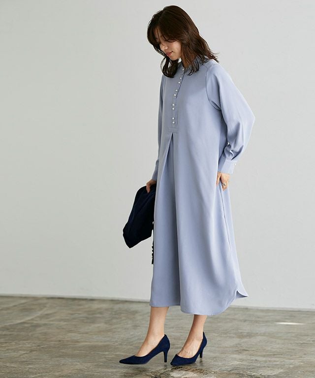 2個ずつ連なったパールボタンが大人可愛いワンピース。きちんと感のあるバンドカラーにふんわりしたボリュームスリーブで優しい印象に。フロントタック入りで体型カバーにも◎