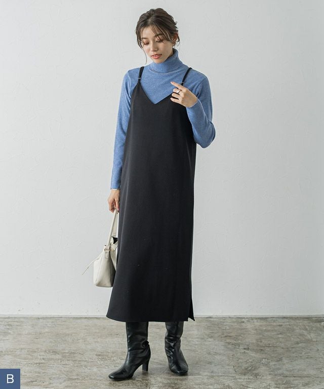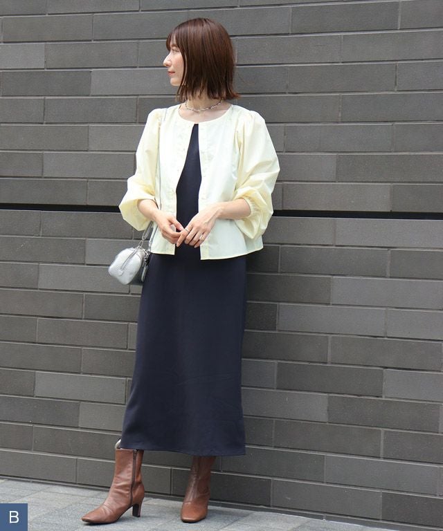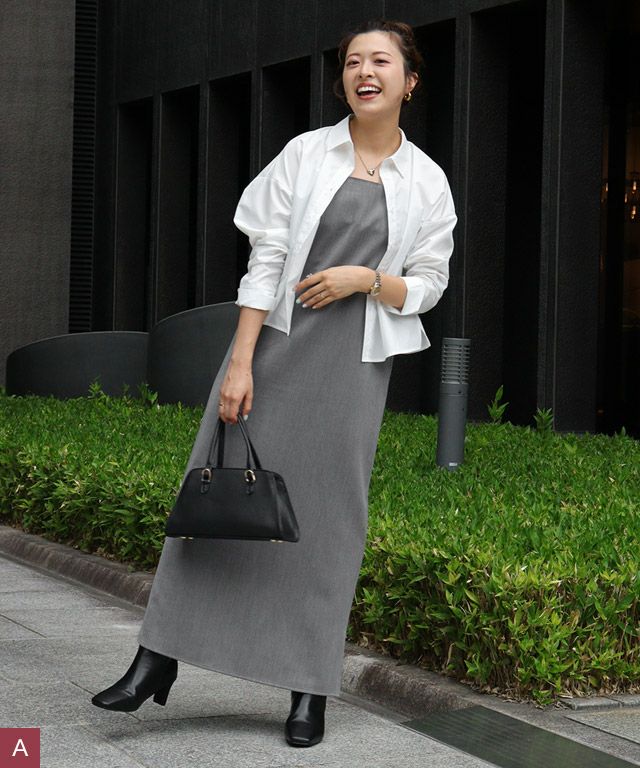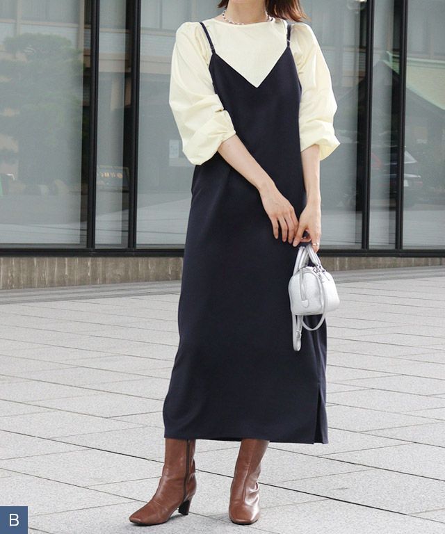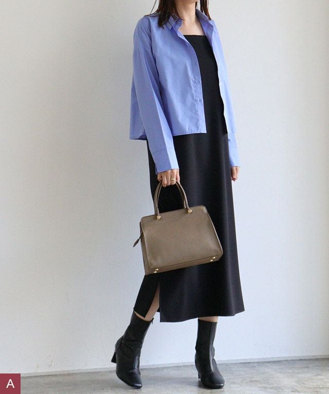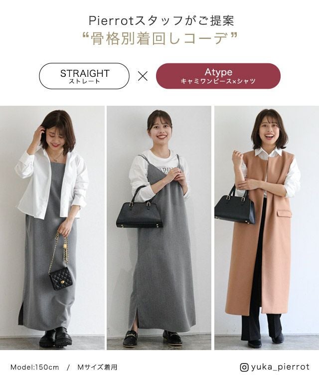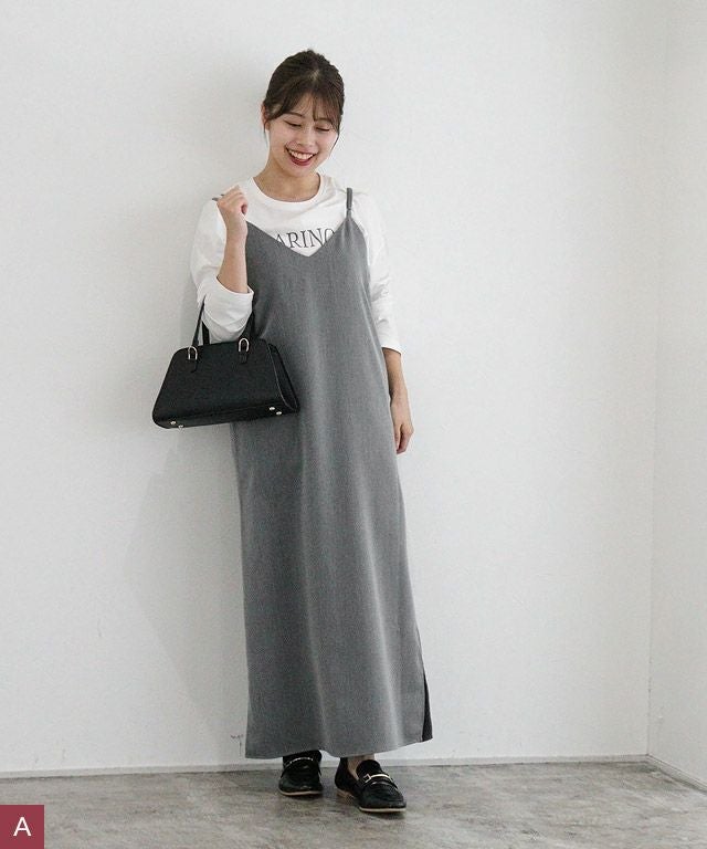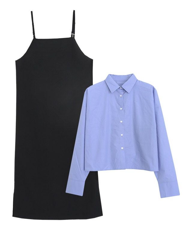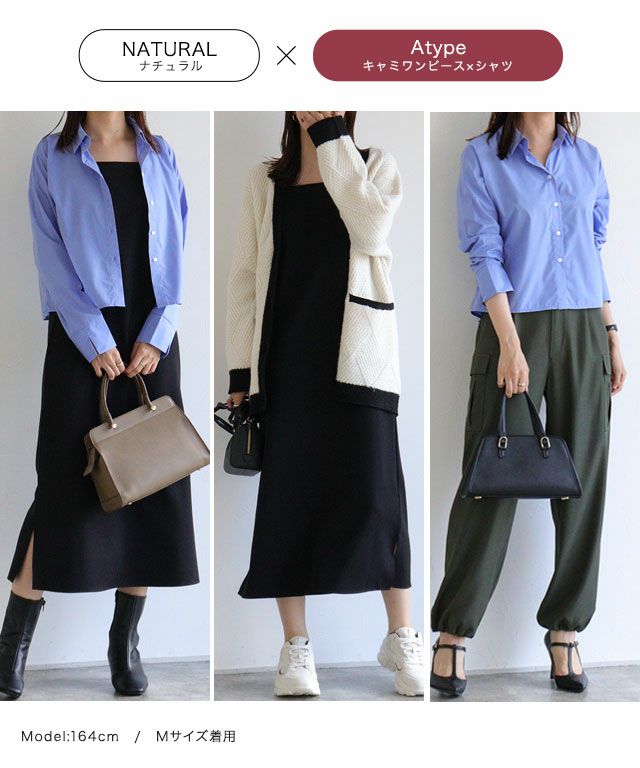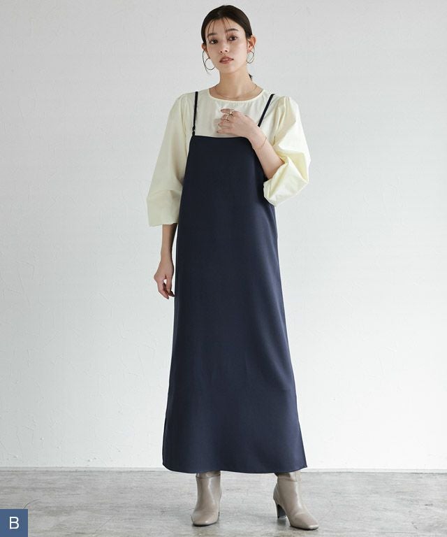 キャミワンピースは前後2wayで着用でき、インナーや着こなしによって雰囲気を変えられます。ブラウスやシャツと合わせやすいIラインで、すっきりシルエットに仕上げました。シャツとブラウスはキャミワンピースのインナーとして着用したり、羽織りとの着用も◎それぞれ単体でも着回しができるので、1セットもっているだけでコーディネートの幅が広がるアイテムです。