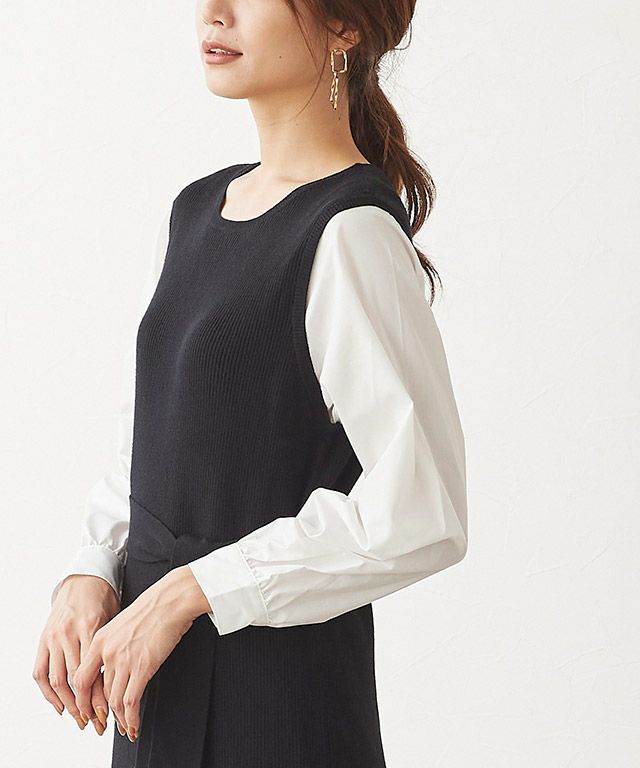 柔らかな風合いのニット素材と、程よくハリ感のあるシャツ素材が女性らしいシルエットを演出します。異素材使いがアクセントになり、重ね着をしなくても大人っぽくほんのりフェミニンなスタイルが叶う一枚です。